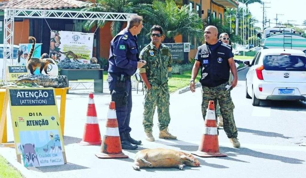 silvestres nas estradas no município. A ação que aconteceu na altura do Centro de Informações Turísticas, contou ainda com a participação da fiscalização ambiental da cidade e da Guarda Municipal Ambiental. A operação contou
