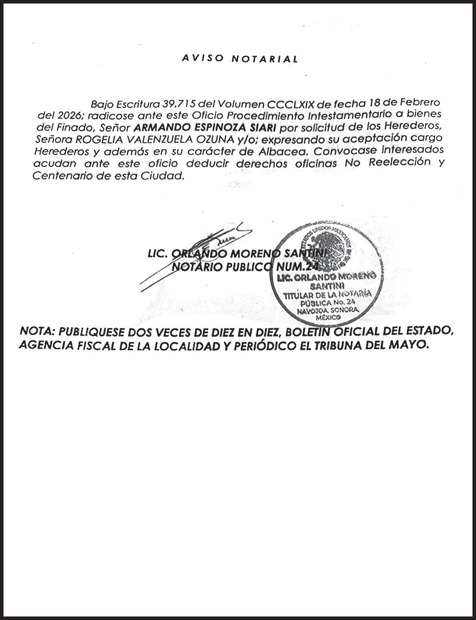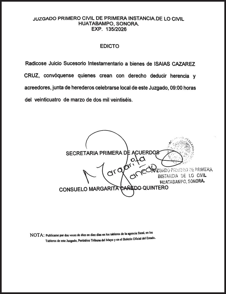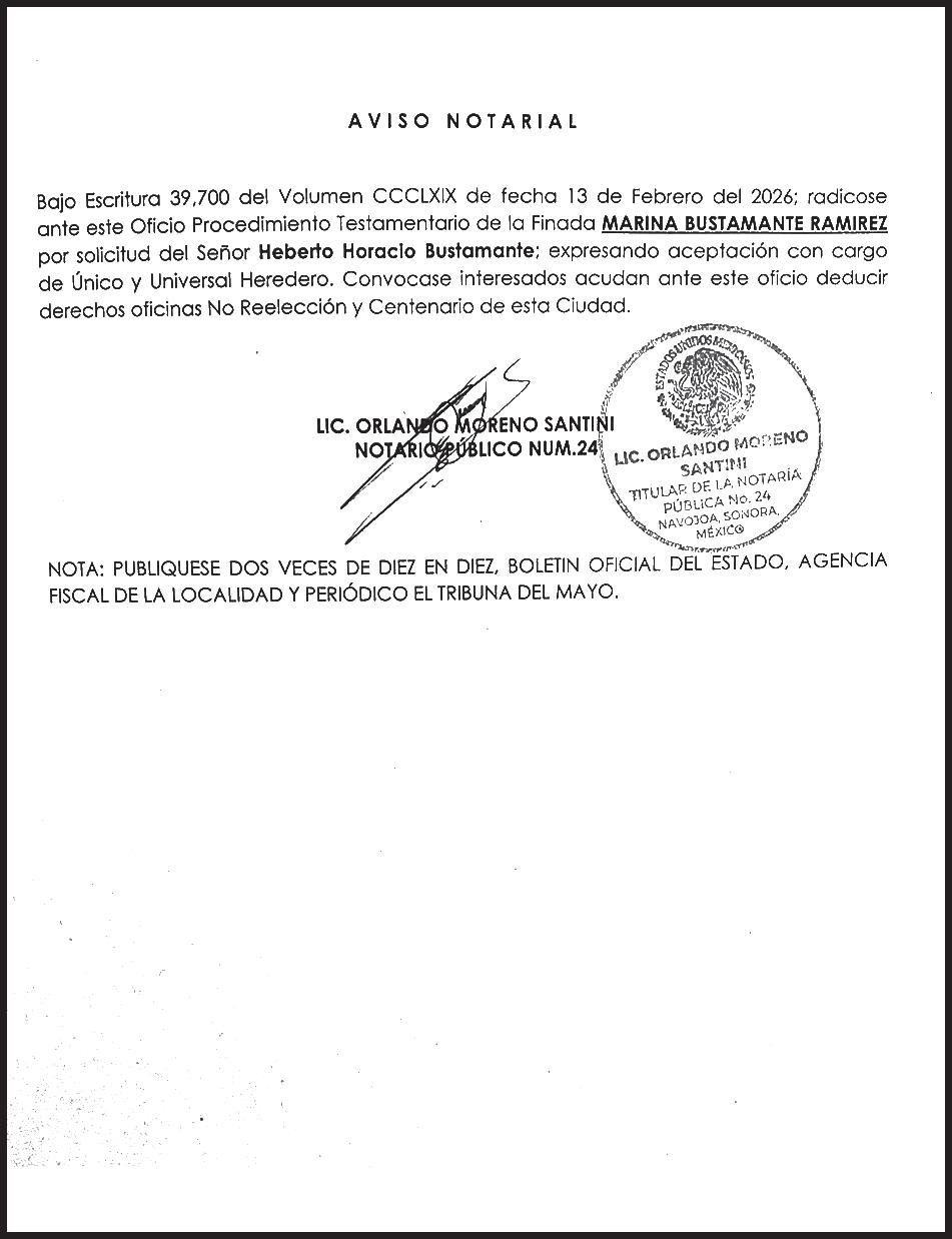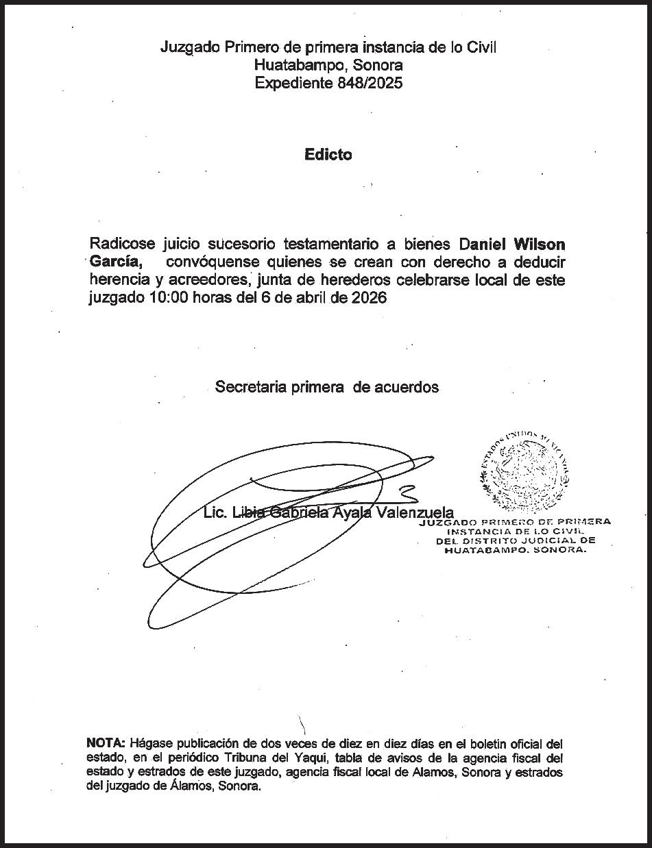 TRIBUNA SONORA, periodicidad Diario, Editor Responsable Sergio Marcial Garcia, Reserva de Derechos al Uso Exclusivo del Título 04-2025-052014313200-101, Certificados de Licitud de Título y Contenido 17817. Con domicilio de la publicación en Gral. José María Yáñez