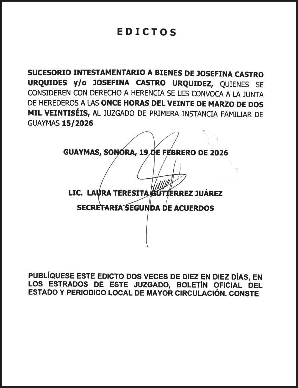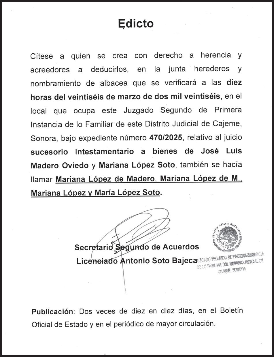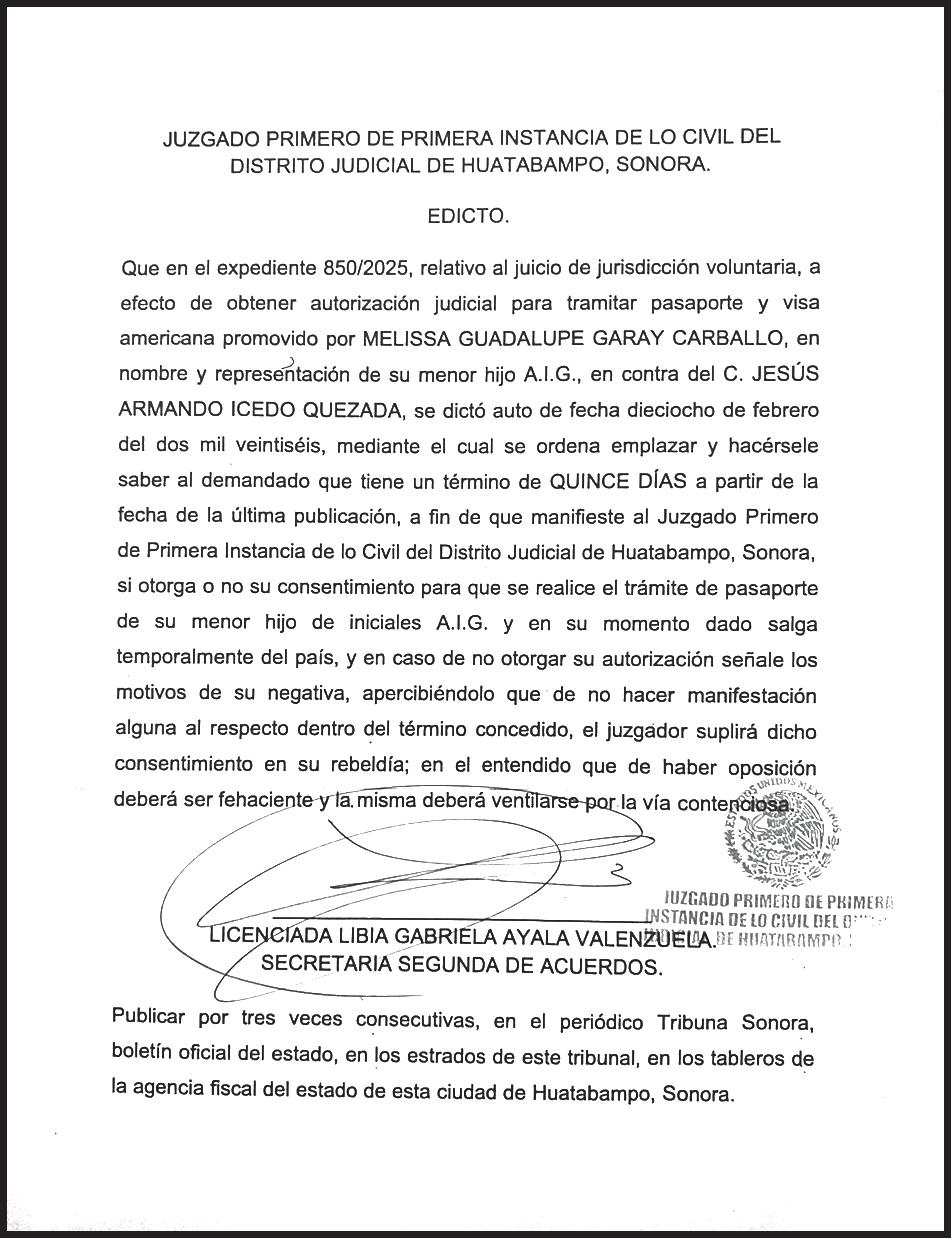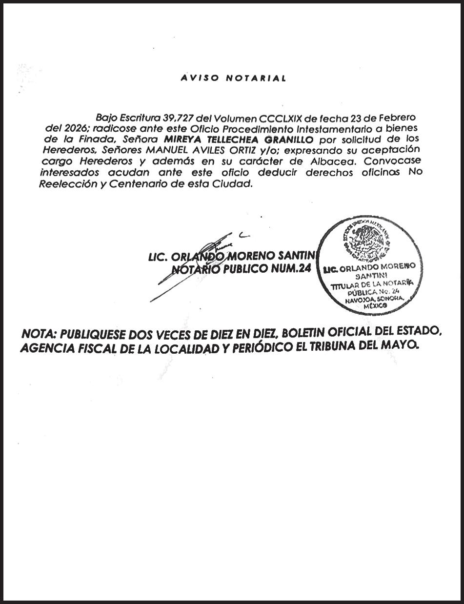 TRIBUNA SONORA, periodicidad Diario, Editor Responsable Sergio Marcial Garcia, Reserva de Derechos al Uso Exclusivo del Título 04-2025-052014313200-101, Certificados de Licitud de Título y Contenido 17817. Con domicilio de la publicación en Gral. José María Yáñez 2, San Benito,