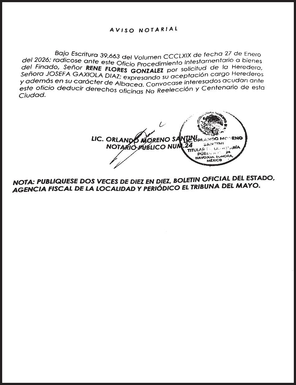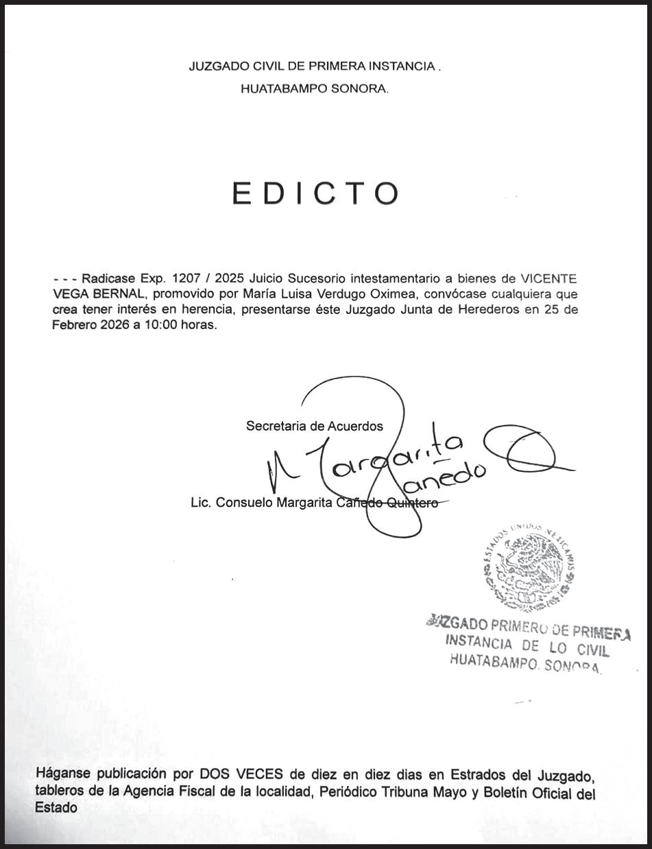TRIBUNA SONORA, periodicidad Diario, Editor Responsable Sergio Marcial Garcia, Reserva de Derechos al Uso Exclusivo del Título 04-2025-052014313200-101, Certificados de Licitud de Título y Contenido 17817. Con domicilio de la publicación en Gral. José María Yáñez 2,