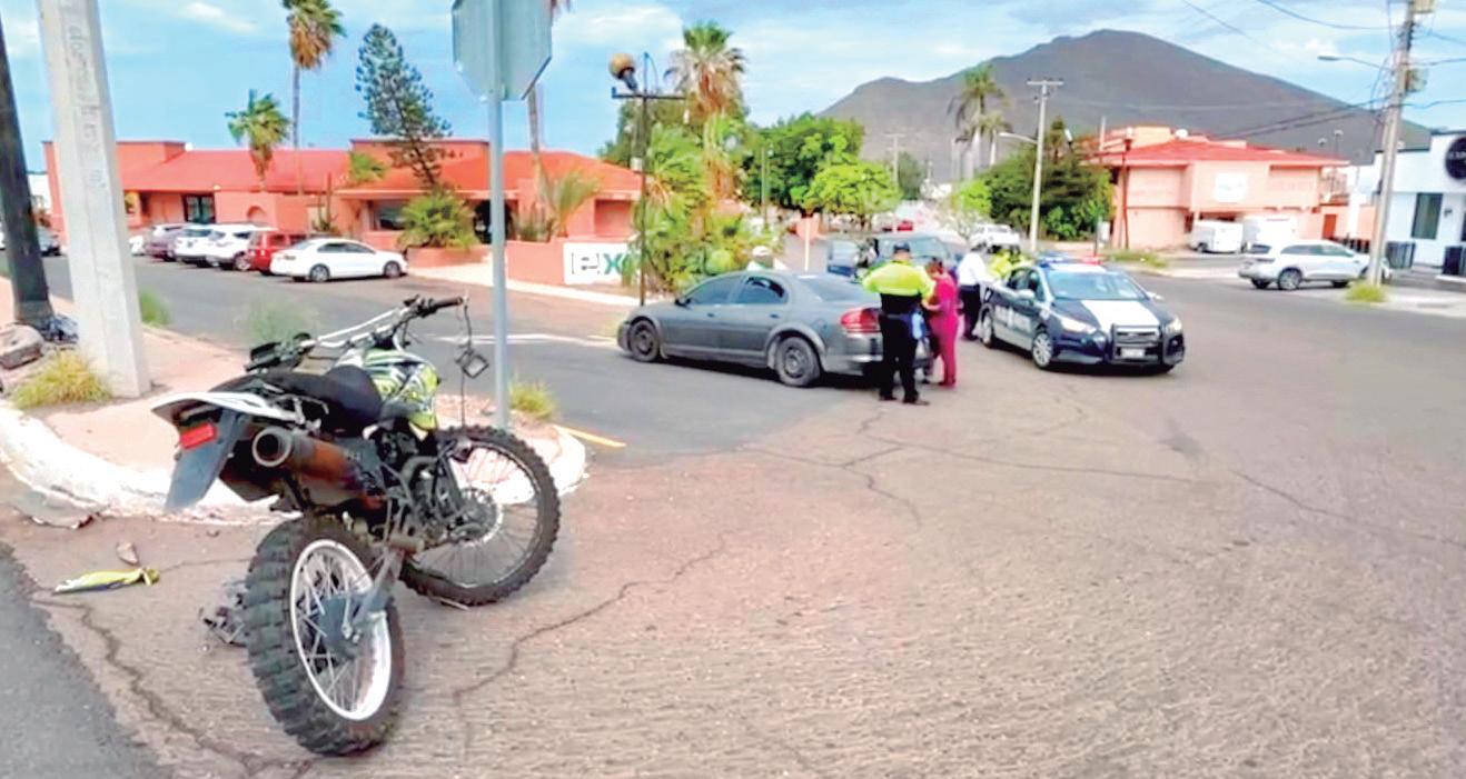 Una motocicleta en la que iban dos personas y un automóvil sedán protagonizaron un choque alrededor de las 9:00 horas de ayer en Guaymas, sobre el bulevar Luis Encinas y la avenida Villa del Mar, en el fraccionamiento Villa de Miramar.