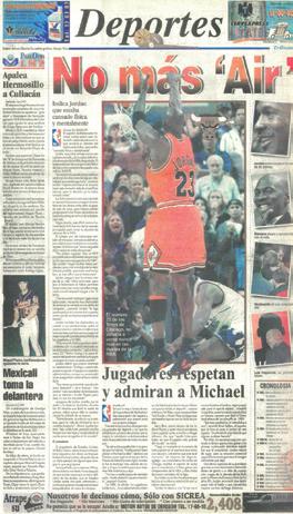 El mundo del deporte, no sólo el del baloncesto, se cimbró la mañana del 13 de enero de 1999, cuando se dio a conocer la noticia del adiós de uno de los más grandes atletas que han maravillado con su magia dentro de las canchas. Argumentando que no tenía más motivación competitiva y que prefería irse en la cima, Michael Jordan anunció que dejaba definitivamente el baloncesto. Y la portada de la sección deportiva de TRIBUNA daba a conocer esta noticia que dejó a todos en silencio: ‘No más Air’.