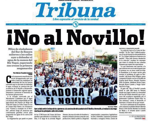 TRIBUNA documentó el momento desde su portada con un titular contundente y directo: “¡No al Novillo!”. La imagen ocupaba casi toda la primera plana: una multitud diversa, jóvenes, adultos, familias enteras, ondeaban pancartas y mantas en defensa del recurso hídrico que consideraban propio. La consigna era clara: defender el agua de Sonora ante lo que percibían como una amenaza para su futuro.
