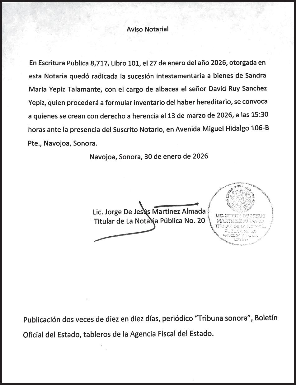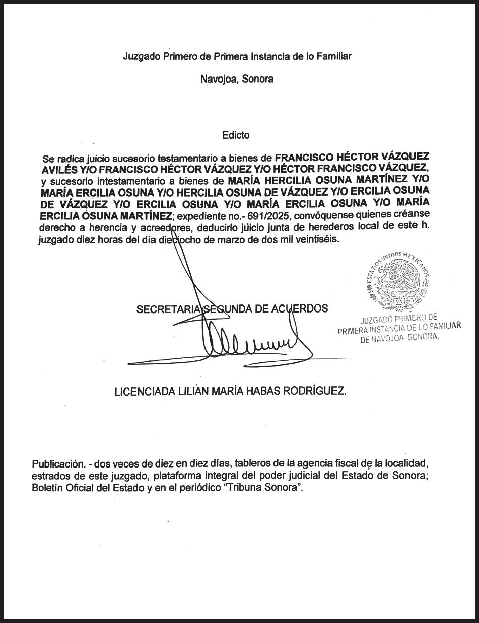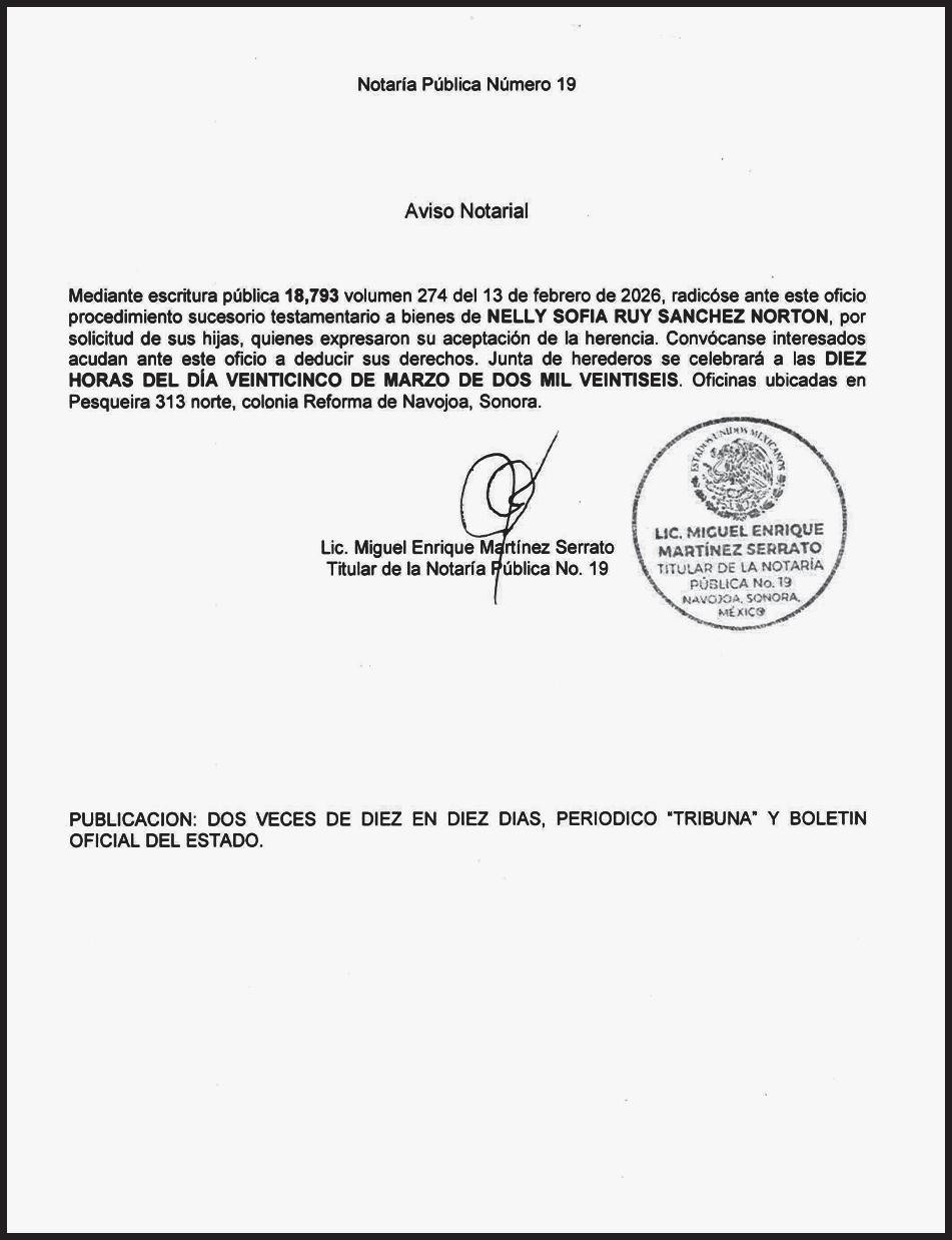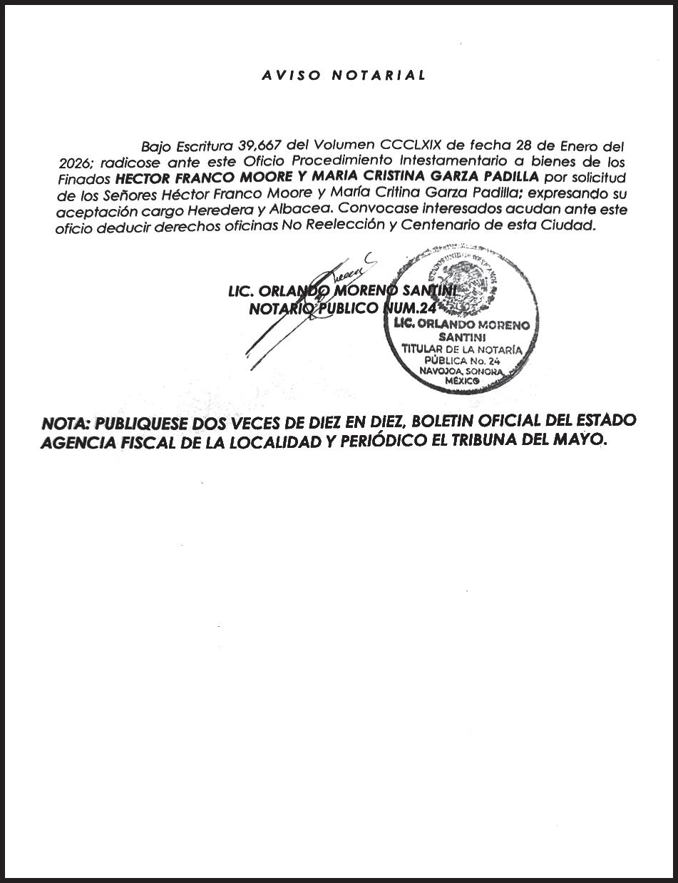 SONORA, periodicidad Diario, Editor Responsable Sergio Marcial Garcia, Reserva de Derechos al Uso Exclusivo del Título 04-2025-052014313200-101, Certificados de Licitud de Título y Contenido 17817. Con domicilio de la publicación en Gral. José María Yáñez
