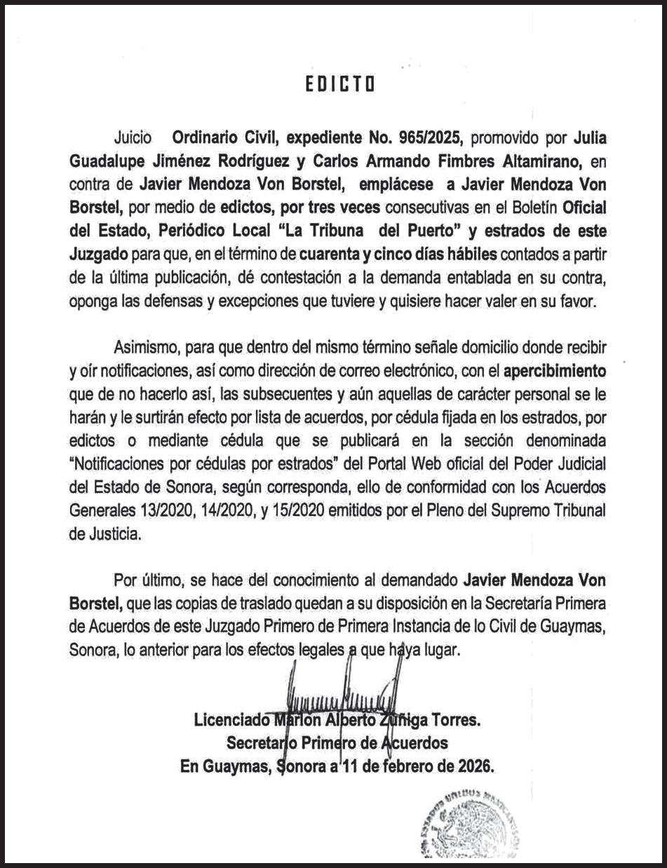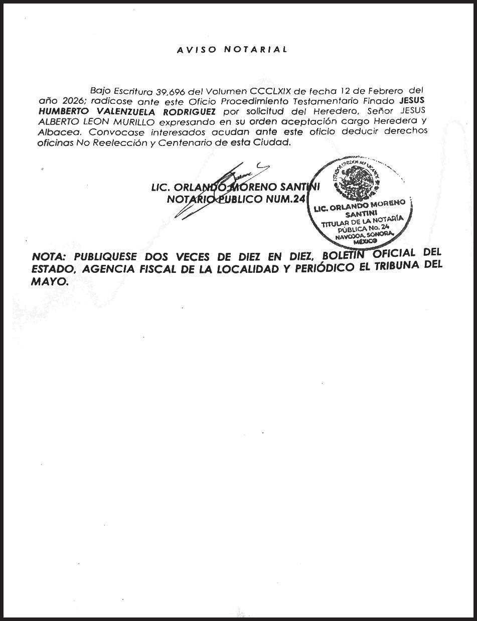 TRIBUNA SONORA, periodicidad Diario, Editor Responsable Sergio Marcial Garcia, Reserva de Derechos al Uso Exclusivo del Título 04-2025-052014313200-101, Certificados de Licitud de Título y Contenido 17817. Con domicilio de la publicación en Gral. José María Yáñez 2, San Benito,