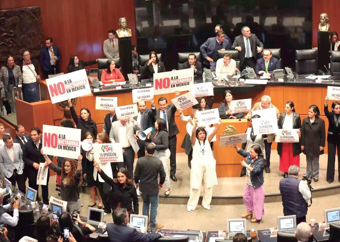 Los panistas, junto con legisladores del PRI, interrumpieron la sesión con gritos y pancartas que acusaban a Morena de imponer una “dictadura”, utilizando altavoces para hacer oír sus protestas en el salón de plenos.