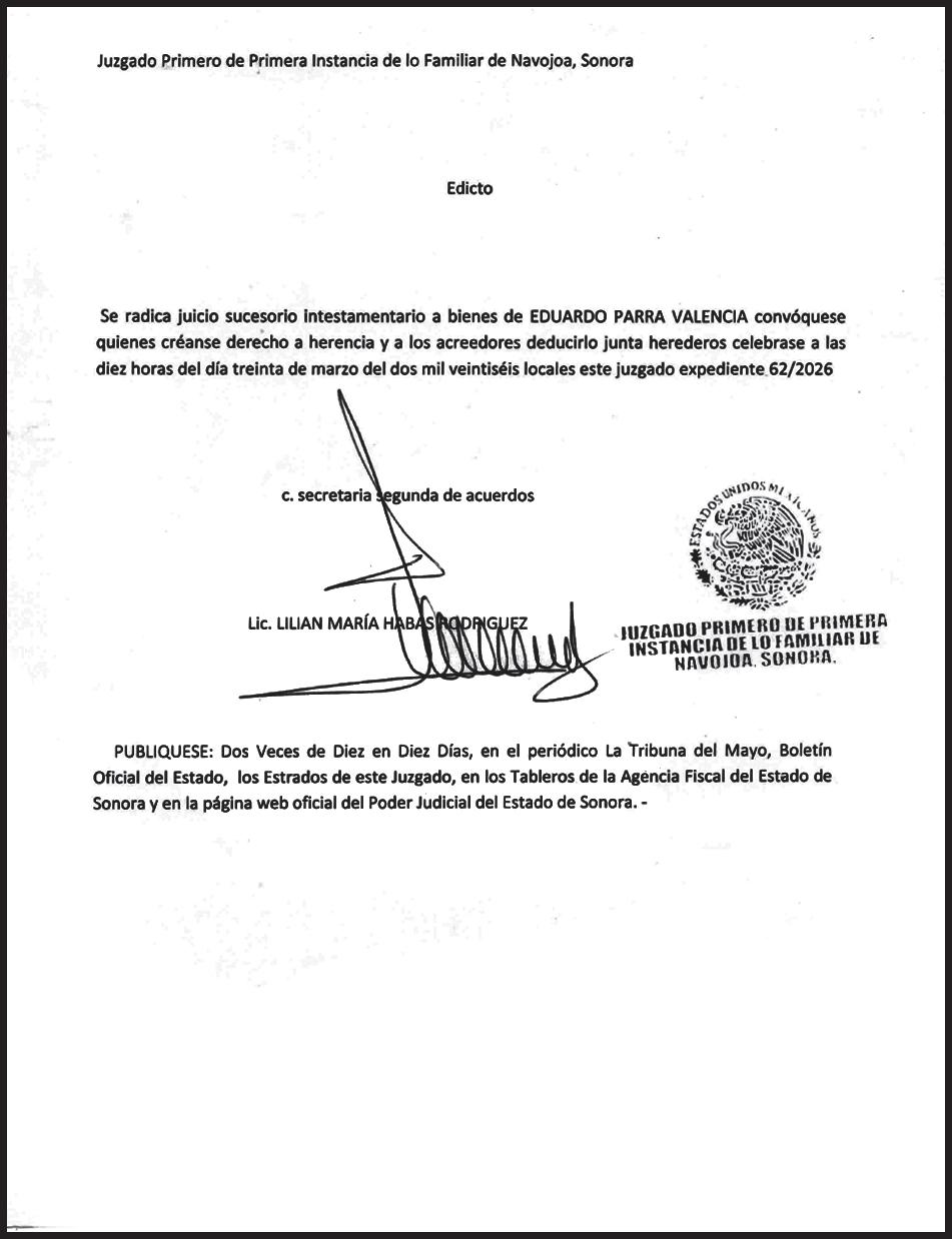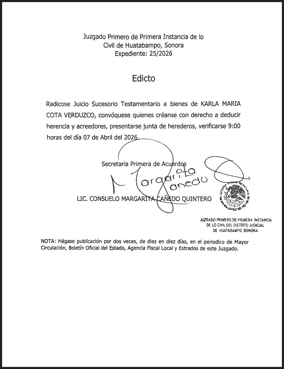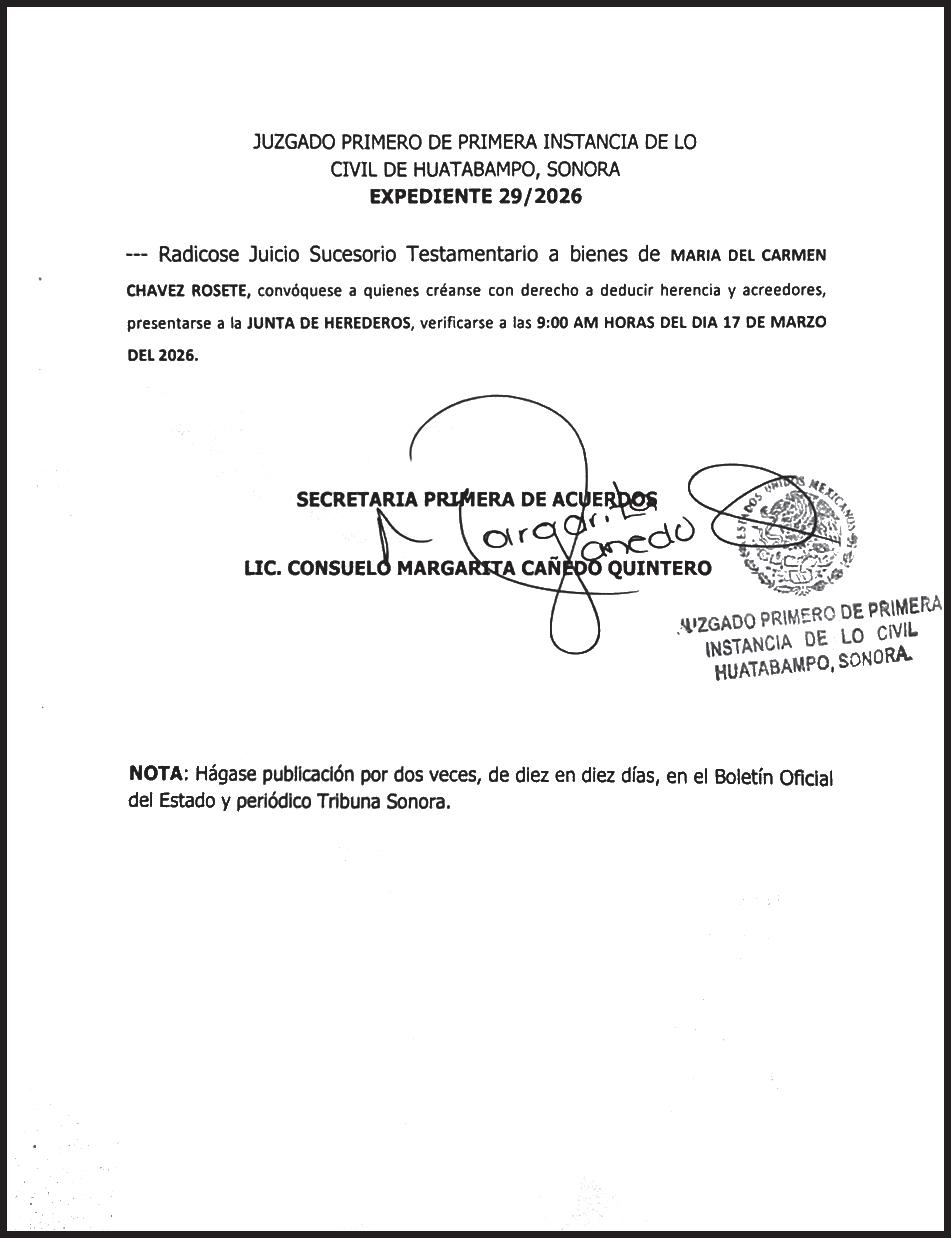 TRIBUNA SONORA, periodicidad Diario, Editor Responsable Sergio Marcial Garcia, Reserva de Derechos al Uso Exclusivo del Título 04-2025-052014313200-101, Certificados de Licitud de Título y Contenido 17817. Con domicilio de la publicación en Gral. José María Yáñez 2, San Benito, Hermosillo, C.P. 83190, Sonora, México. Impreso y distribuido por Líneas