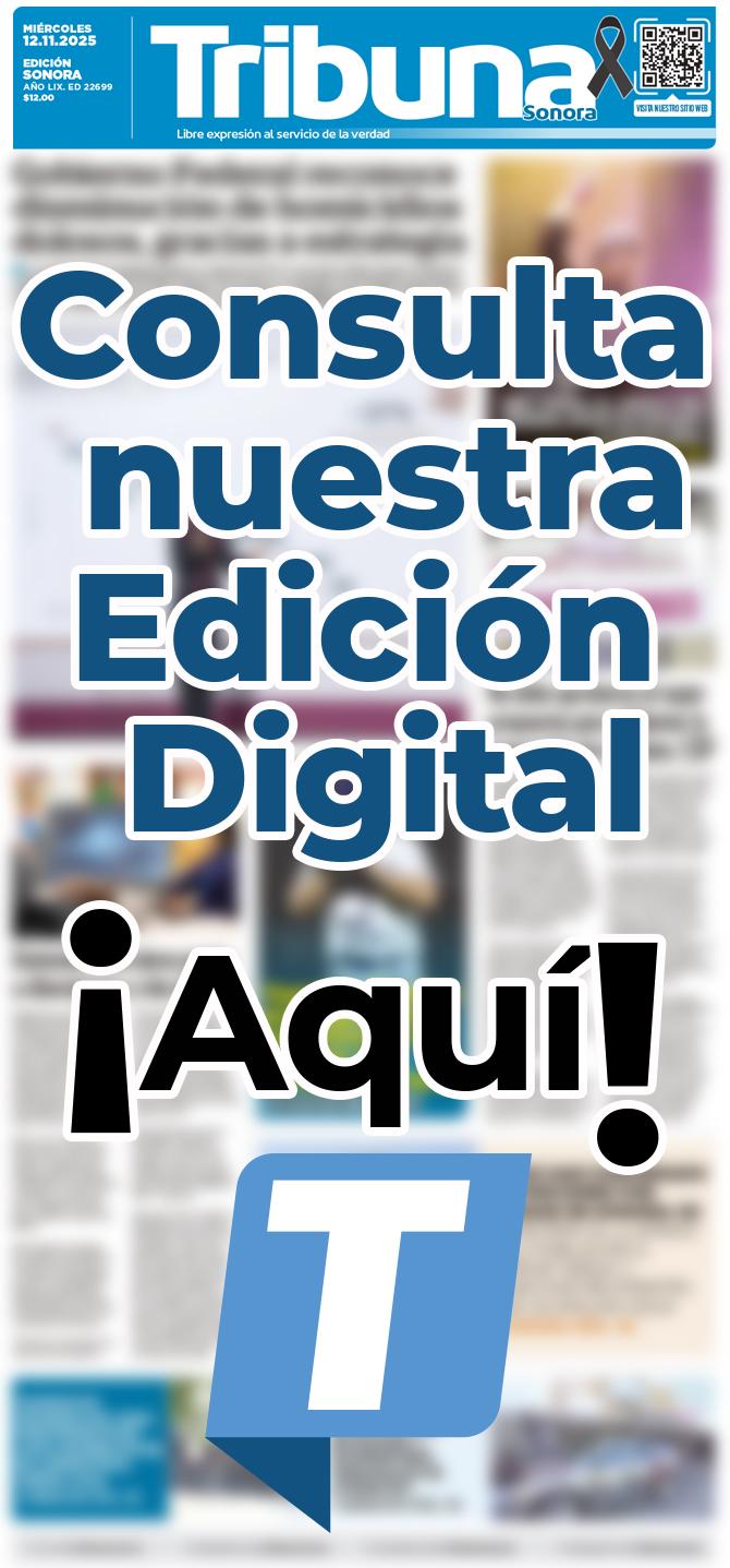 TRIBUNA SONORA, periodicidad Diario, Editor Responsable Hilario Olea Fontes, Reserva de Derechos al Uso Exclusivo del Título 04-2025-052014313200-101, Certificados de Licitud de Título y Contenido 17817. Con domicilio de la publicación en Gral. José María Yáñez 2, San Benito, Hermosillo, C.P. 83190, Sonora, México. Impreso y distribuido por Líneas Sonora Hoy CW, Blvd. Rodolfo Elías Calles #278 Ote. Col. Campestre, entre Durango y Juan Álvarez, C.P. 85160, Cajeme, Sonora.