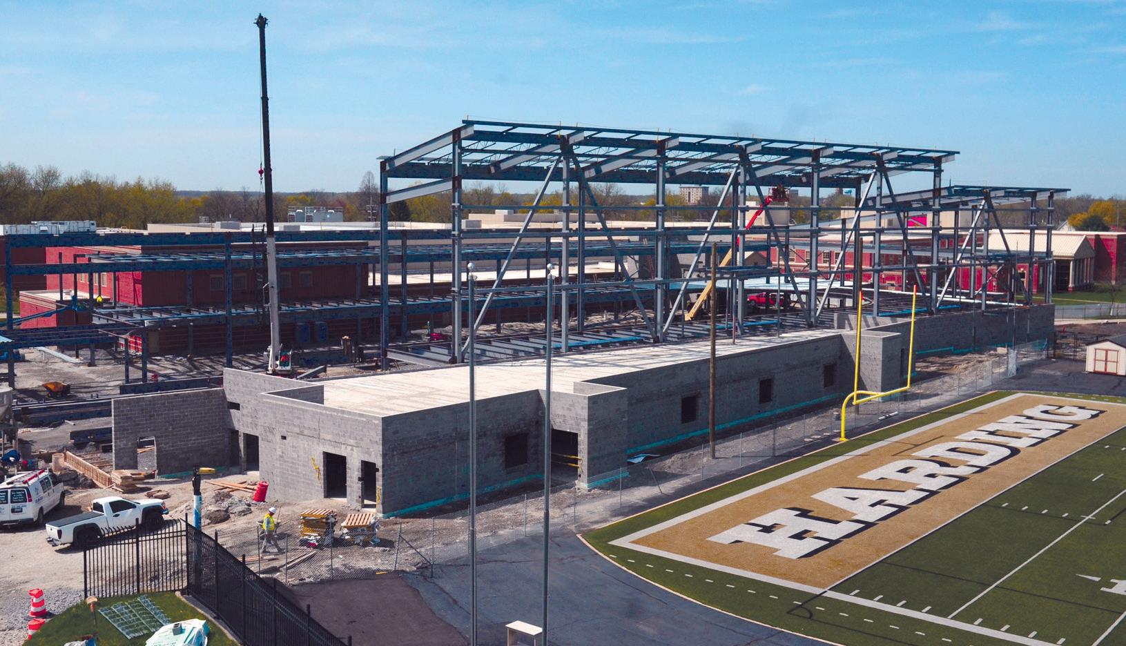 The steel skeleton in April 2023 of the new Student Recreation and Wellness Center for Warren City Schools.