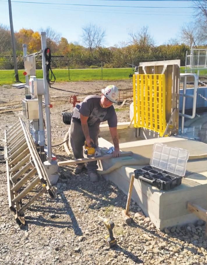 In this April 2023 photo, plumber Landon Slusher of Howland, who was working for Komar Anchor Plumbing of Youngstown, installs plumbing in one of the new locker rooms at Warren City Schools’ Student Recreation and Wellness Center.