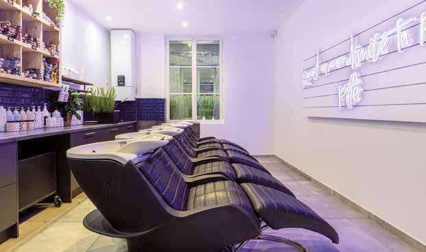 Situé au fond d’une cour parisienne, voici un écrin bien caché pour le coloriste de génie Pierre Carli. L’espace se veut contemporain dont les maîtres-mots sont expertise, simplicité et décontraction. Cet espace signé par les designers de Nouvelles Substances est une véritable balade graphique, ode à la Provence natale du coiffeur : un bleu lavande éclatant, baigné dans la douceur de l’ocre du soleil couchant, et la symbolique de l’olivier pour la paix et la quiétude. La zone de bacs intègre le Fly, iconique de la marque italienne Palladium. On remarque aussi le non moins indispensable fauteuil Mademoiselle de Cindarella. Élégance et sobriété, tout un poème.