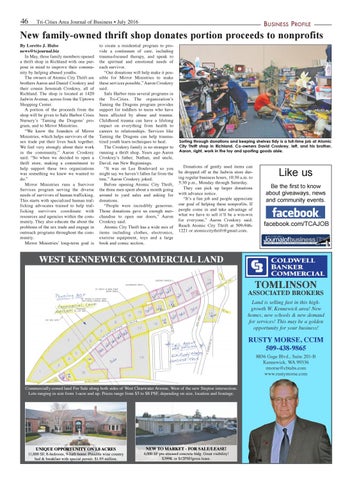 New family-owned thrift shop donates portion proceeds to nonprofits By Loretto J. Hulse news@tcjournal.biz In May, three family members opened a thrift shop in Richland with one purpose in mind to improve their community by helping abused youths. The owners of Atomic City Thrift are brothers Aaron and Daniel Croskrey and their cousin Jeremiah Croskrey, all of Richland. The shop is located at 1420 Jadwin Avenue, across from the Uptown Shopping Center. A portion of the proceeds from the shop will be given to Safe Harbor Crisis Nursery’s ‘Taming the Dragons’ program, and to Mirror Ministries. “We know the founders of Mirror Ministries, which helps survivors of the sex trade put their lives back together. We feel very strongly about their work in the community,” Aaron Croskrey said. “So when we decided to open a thrift store, making a commitment to help support these two organizations was something we knew we wanted to do.” Mirror Ministries runs a Survivor Services program serving the diverse needs of survivors of human trafficking. This starts with specialized human trafficking advocates trained to help trafficking survivors coordinate with resources and agencies within the community. They also educate the about the problems of the sex trade and engage in outreach programs throughout the community. Mirror Ministries’ long-term goal is