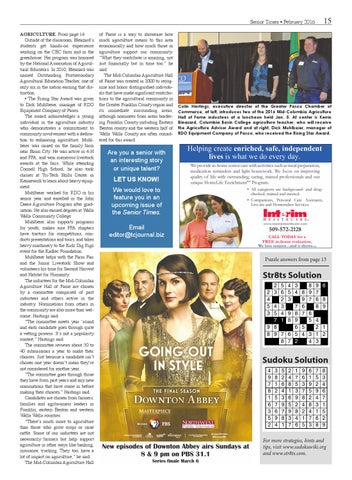 Senior Times • February 2016 AGRICULTURE, From page 14 Outside of the classroom, Bleazard’s students get hands-on experience working on the CBC farm and in the greenhouse. Her program was honored by the National Association of Agricultural Educators. In 2010, Bleazard was named Outstanding Postsecondary Agricultural Education Teacher, one of only six in the nation earning that distinction. • The Rising Star Award was given to Dick Muhlbeier, manager of RDO Equipment Company of Pasco. The award acknowledges a young individual in the agriculture industry who demonstrates a commitment to community involvement with a dedication to enhancing agriculture. Muhlbeier was raised on the family farm near Basin City. He was active in 4-H and FFA, and won numerous livestock awards at the fairs. While attending Connell High School, he also took classes at Tri-Tech Skills Center in Kennewick to learn about heavy equipment. Muhlbeier worked for RDO in his senior year and excelled in the John Deere Agriculture Program after graduation. He also earned degrees at Walla Walla Community College. Muhlbeier also supports programs for youth, makes sure FFA chapters have tractors for competitions, conducts presentations and tours, and takes heavy machinery to the Kidz Dig Rigz event for the Kadlec Foundation. Muhlbeier helps with the Farm Fair and the Junior Livestock Show and volunteers his time for Second Harvest and Habitat for Humanity. The inductees for the Mid-Columbia Agriculture Hall of Fame are chosen by a committee comprised of past inductees and others active in the industry. Nominations from others in the community are also more than welcome, Hastings said. “The committee meets year ‘round and each candidate goes through quite a vetting process. It’s not a popularity contest,” Hastings said. The committee reviews about 30 to 40 submissions a year to make their choices. Just because a candidate isn’t chosen one year doesn’t mean they’re not considered for another year. “The committee goes through those they have from past years and any new nominations that have come in before making their choices,” Hastings said. Candidates are chosen from farmers, families and agribusiness leaders in Franklin, eastern Benton and western Walla Walla counties. “There’s much more to agriculture than those who grow crops or raise cattle. Some of our inductees are not necessarily farmers but help support agriculture in other ways like banking, insurance, trucking. They, too, have a lot of impact on agriculture,” he said. The Mid-Columbia Agriculture Hall