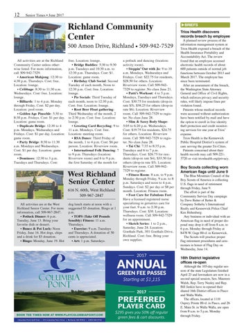a potluck and dancing (location: activity room). • Steppin’ Out with Jo: 9 to 10 a.m. Mondays, Wednesdays and Fridays. Cost: $22.75 for residents, $28.50 for others. Location: Riverview room. Call 509-9427529 to register. No class June 21. • Patti’s Workout: 4 to 5 p.m. Mondays, Tuesdays and Thursdays. Cost: $30.75 for residents (drop-in rate $5), $38.25 for others (drop-in rate $6). Location: Riverview room. Call 509-942-7529 to register. No class June 28. • Slim & Sassy Body Shape: 5:05 to 6:20 p.m. Wednesdays. Cost: $19.75 for residents, $24.75 for others. Location: Riverview room. Call 509-942-7529 to register. No class June 28. • Tai Chi: 7:35 to 8:35 p.m. Tuesdays and 6 to 7 p.m. Thursdays. Cost: $26.75 for residents (drop-in rate $4), $33.50 for others (drop-in rate $5). Location: Riverview room. Call 509-9427529 to register. • Fitness Room: 8 a.m. to 9 p.m. Monday through Friday, 9 a.m. to 8 p.m. Saturdays and noon to 4 p.m. Sundays. Cost: $2 per day or $8 per month. Location: Fitness room. • Foot Care for Fabulous Feet: Have a licensed registered nurse specializing in geriatrics care for your feet. 9 a.m. to 2:30 p.m. Thursdays. Cost: $30. Location: wellness room. Call 509-942-7529 for an appointment. • Sketch Series: 1 to 2 p.m., Saturday, June 24. Location: Goethals Park, 301 Goethals Drive, Richland. Cost: free. Bring your own supplies.