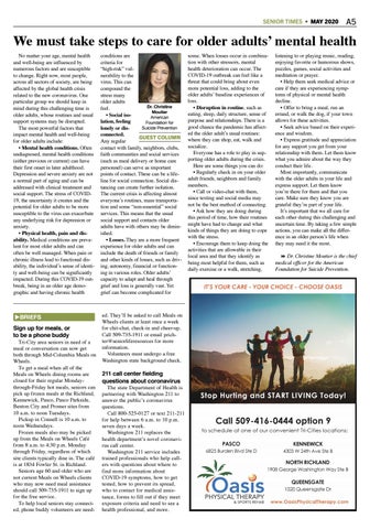 conditions are criteria for “high-risk” vulnerability to the virus. This can compound the stress many older adults Dr. Christine feel. Moutier • Social isoAmerican lation, feeling Foundation for Suicide Prevention lonely or disconnected. GUEST COLUMN Any regular contact with family, neighbors, clubs, faith communities and social services (such as meal delivery or home care personnel) can serve as important points of contact. These can be a lifeline for social connection. Social distancing can create further isolation. The current crisis is affecting almost everyone’s routines, mass transportation and some “non-essential” social services. This means that the usual social support and contacts older adults have with others may be diminished. • Losses. They are a more frequent experience for older adults and can include the death of friends or family and other kinds of losses, such as driving, autonomy, financial or functioning in various roles. Older adults’ capacity to adapt and heal through grief and loss is generally vast. Yet grief can become complicated for