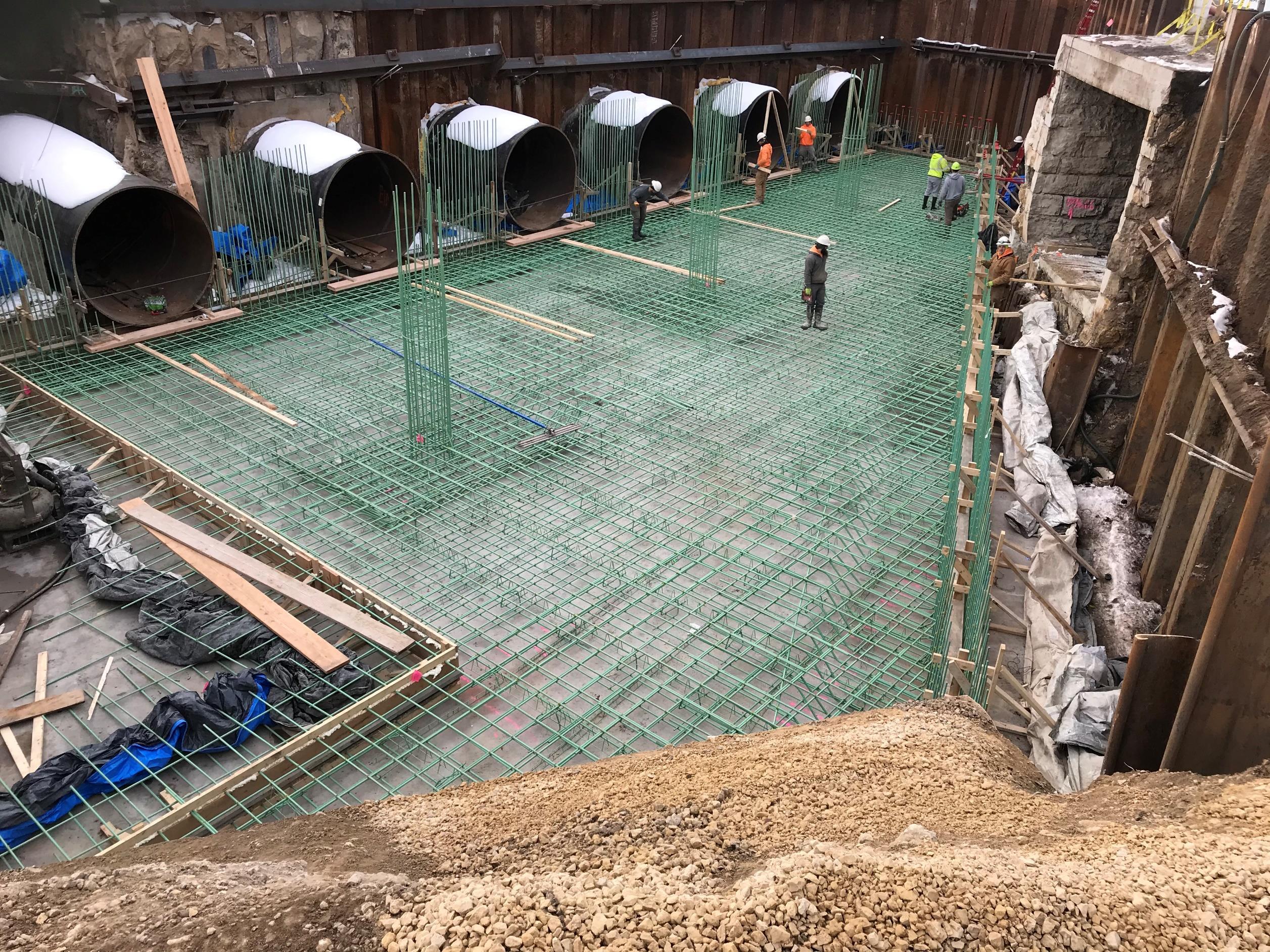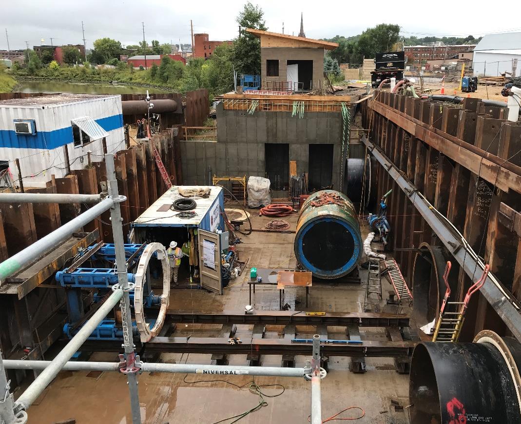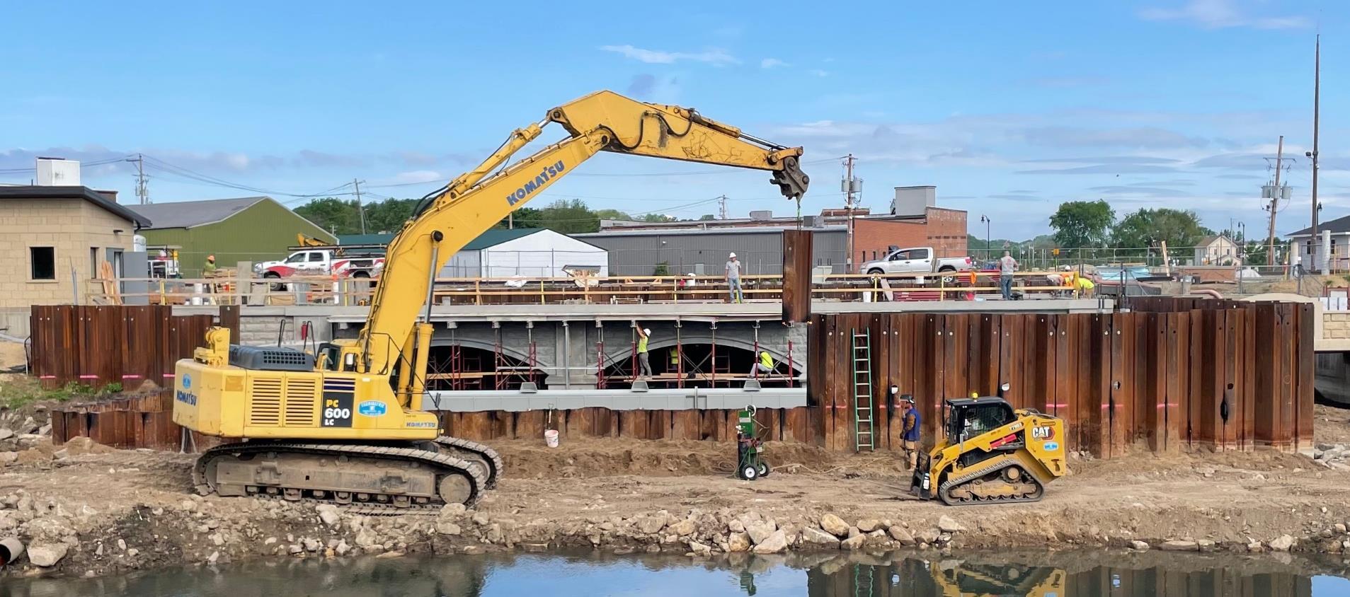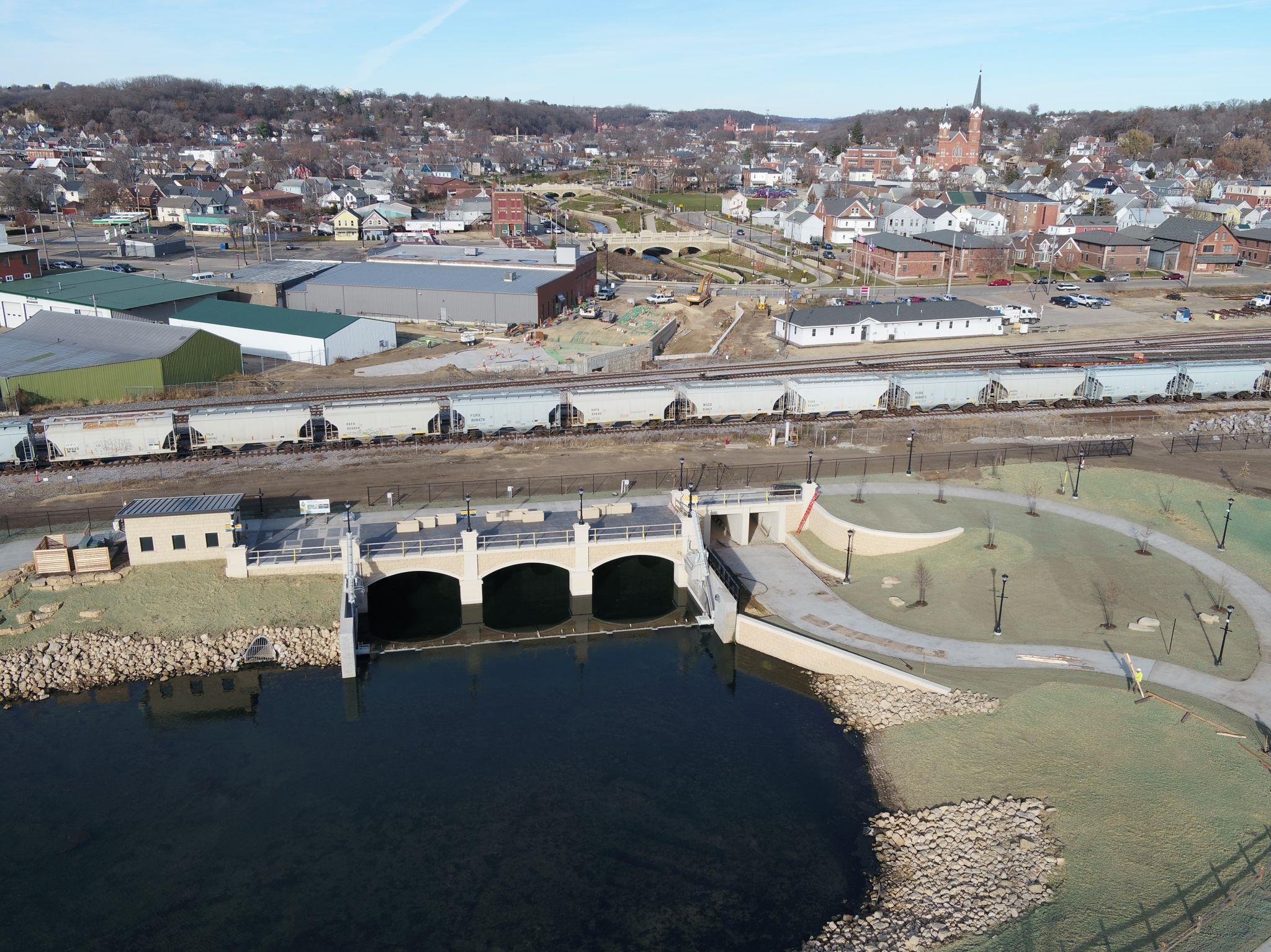 Tricon completed this very technically difficult project for the City of Dubuque. The Railroad Culverts Project is a critical phase of the larger Bee Branch Watershed Flood Mitigation Project and will increase the flood mitigation system’s capacity to protect the area from a 75-year rain event to a 500-year rain event. The railroad culverts project involved using micro-tunneling methods to install six, 8-foot diameter culverts under the Canadian Pacific Railway (CP) tracks along Garfield Ave. This will allow stormwater to drain more efficiently from the Upper Bee Branch Creek to the Lower Bee Branch Creek and 16th St. Detention Basin. The six steel culverts were installed under the CP Railroad tracks while the trains remained operational. A jacking system was constructed below the Bee Branch water basin and the culverts were installed by boring 200’ long tunnels 20’ under the railroad. Each pipe required considerable prep work including cutting the holes through the sheet pile walls to allow the micro-tunneling machine to pass. This project took 2.5 years to construct.