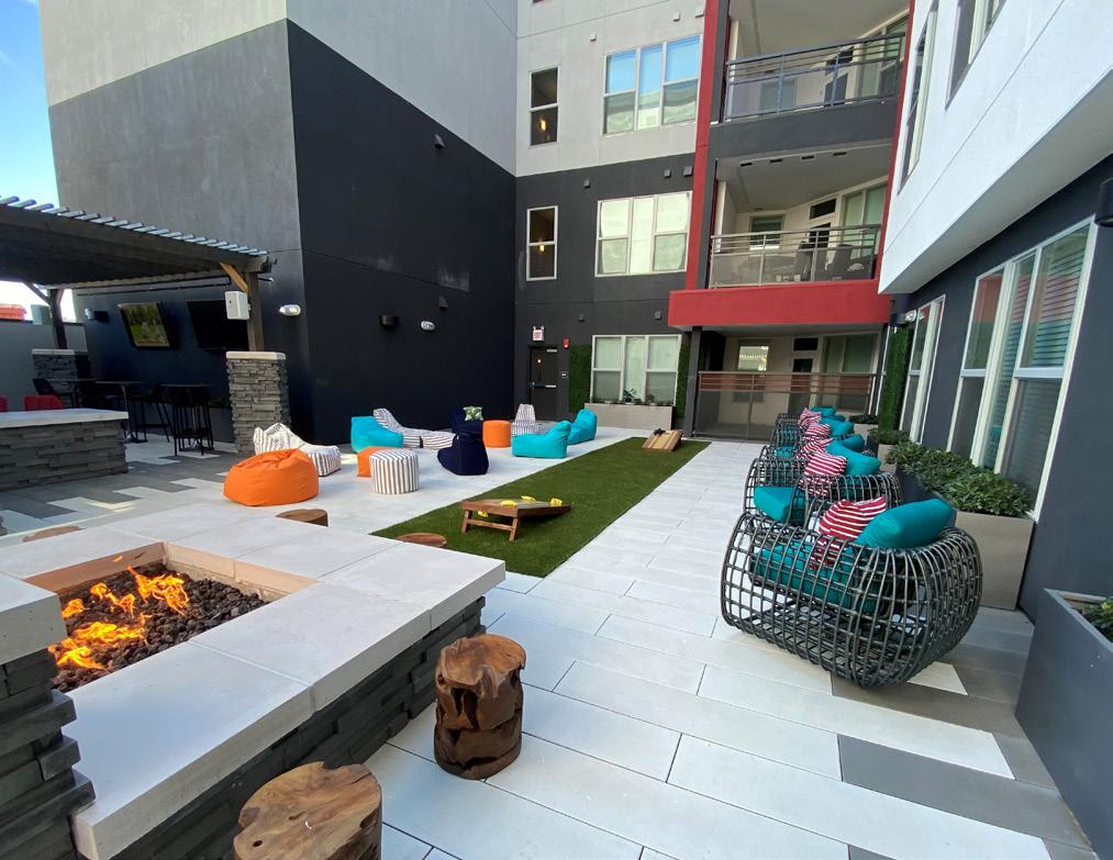 Exterior onsite improvements for this 2-story, 4000 sf, 132 room hotel, which included an outdoor fire table, site concrete improvement, cable railings, planters, lighting, outdoor seating area, fencing, decking, and minor remodel of the entry door.