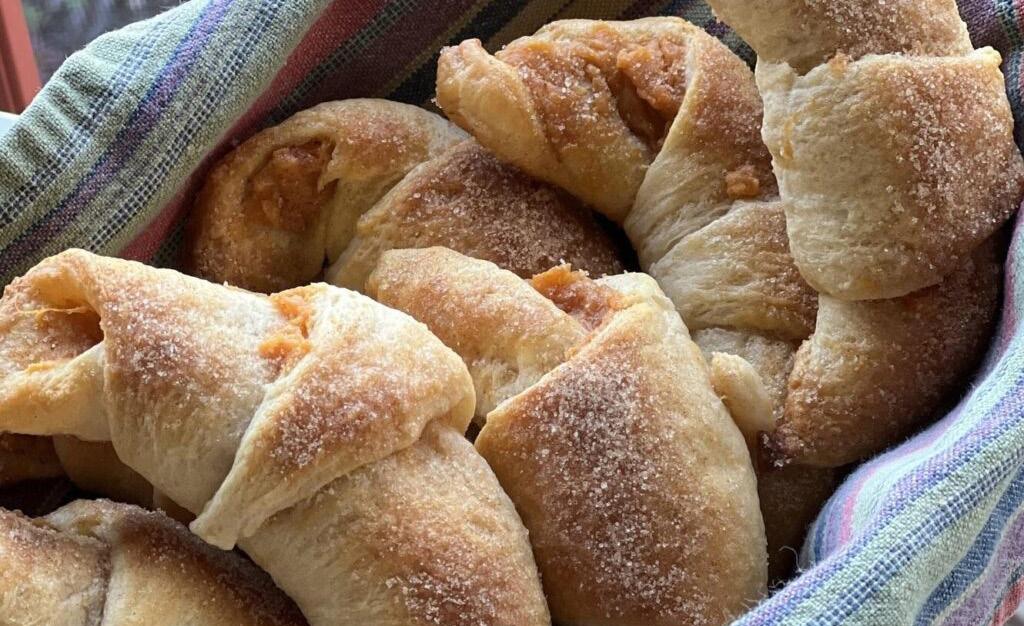 Open crescent rolls and separate into individual pieces. Divide sweet potato mixture evenly between the dough, about 2 tablespoons each. Spread mixture evenly on dough. Beginning at wider end, roll dough lightly until pointed end is on top. Place on parchment lined baking sheet, then bend slightly to form crescent shape. Combine granulated sugar and 1/2 teaspoon ground cinnamon. Brush each roll with melted butter, then sprinkle generously with cinnamon sugar. Bake in preheated oven 15 – 18 minutes or until golden. Serve warm.