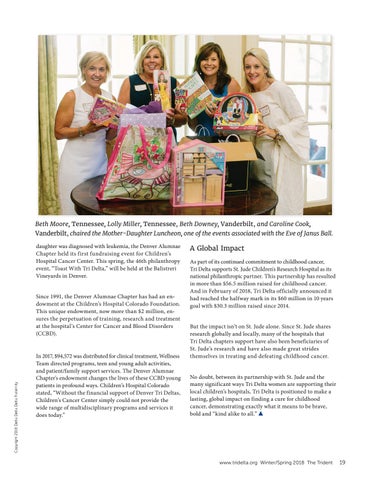 Beth Moore, Tennessee, Lolly Miller, Tennessee, Beth Downey, Vanderbilt, and Caroline Cook, Vanderbilt, chaired the Mother-Daughter Luncheon, one of the events associated with the Eve of Janus Ball. daughter was diagnosed with leukemia, the Denver Alumnae Chapter held its first fundraising event for Children’s Hospital Cancer Center. This spring, the 46th philanthropy event, “Toast With Tri Delta,” will be held at the Balistreri Vineyards in Denver.