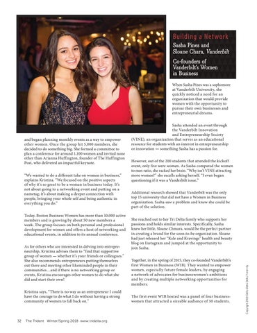 Building a Network Sasha Pines and Sloane Chara, Vanderbilt Co-founders of Vanderbilt’s Women in Business When Sasha Pines was a sophomore at Vanderbilt University, she quickly noticed a need for an organization that would provide women with the opportunity to pursue their own businesses and entrepreneurial dreams.