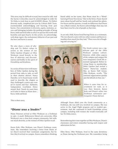 Looking for some inspiration on exactly how to do this? Read about the brave, bold and kind women who were collegians in the 1960s in our Delta Upsilon Chapter at Ohio Wesleyan on p. 26. Their story of standing up for a sister—and for one another—is one we’re honored to tell as Tri Delta continues to learn and grow as an organization founded to be kind alike to all.
