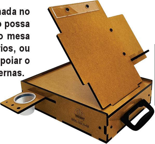 O suporte para pinceis e copo, e o porta-celular, podem ser posicionados do lado esquerdo ou direito do usuário de acordo com sua preferência.