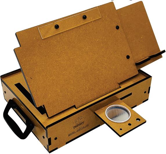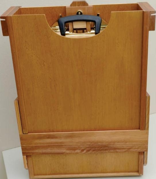 Prático estojo-cavalete para estúdio ou campo. Seu interior muito espaçoso possui prateleiras para acomodar melhor, tintas, pincéis e outros acessórios. Acompanha duas paletas de fórmica, que podem ser facilmente encaixadas em suas laterais. Possui alça para transporte. Suporta tela de até 90 cm.