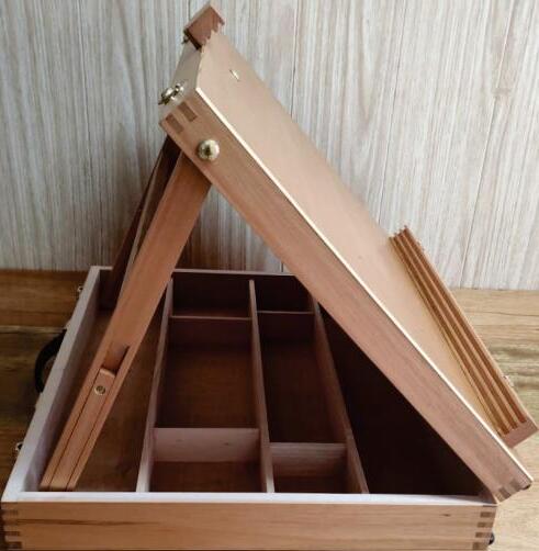 Com divisões internas, paleta de compensado 3 mm e alça para transporte. Os suportes corrediços do tampo, possibilitam ajustes de inclinação da tela de 0º à 90º graus. Comporta telas de até 64 cm.