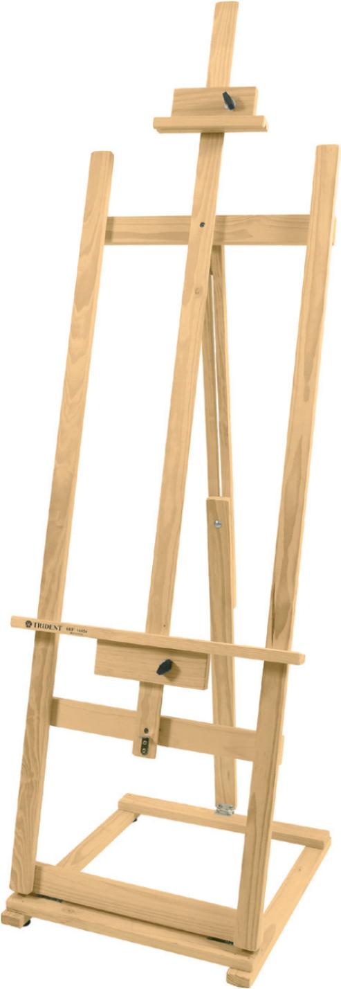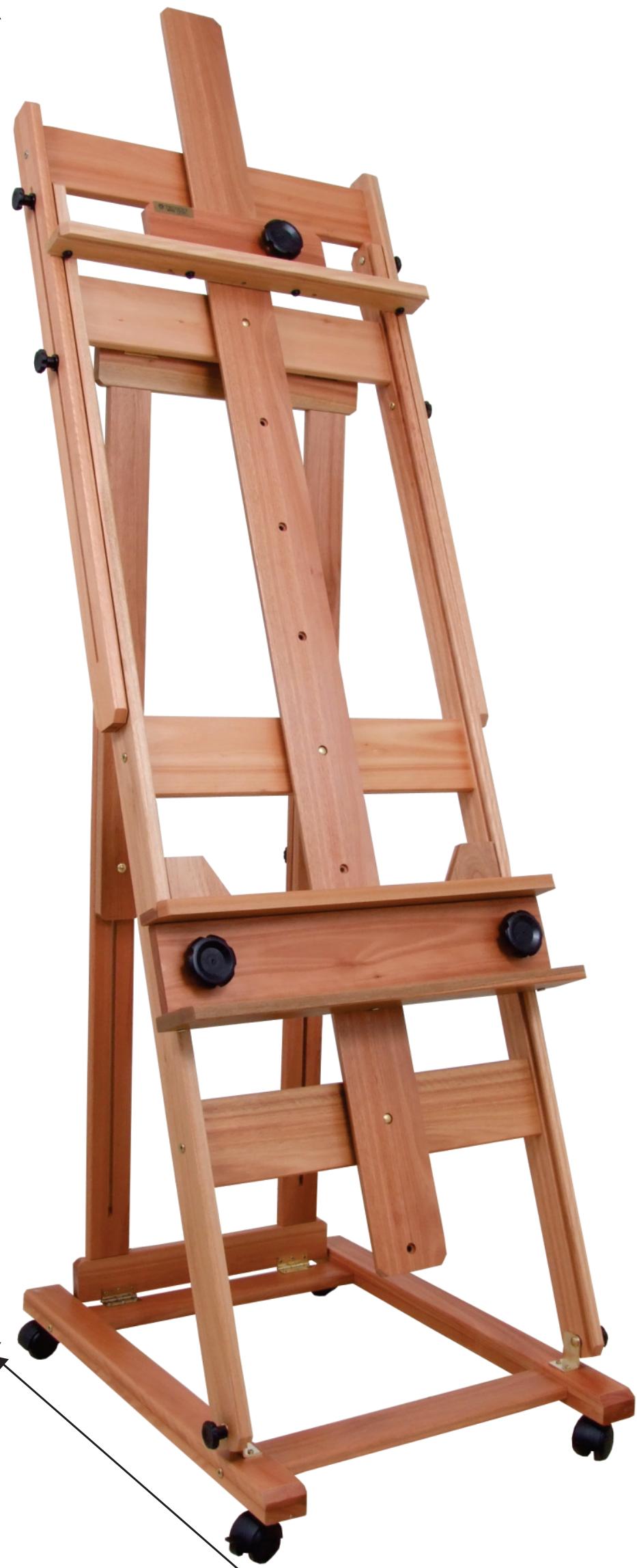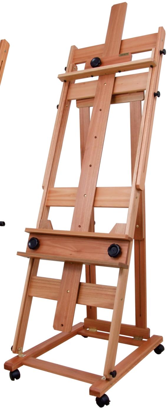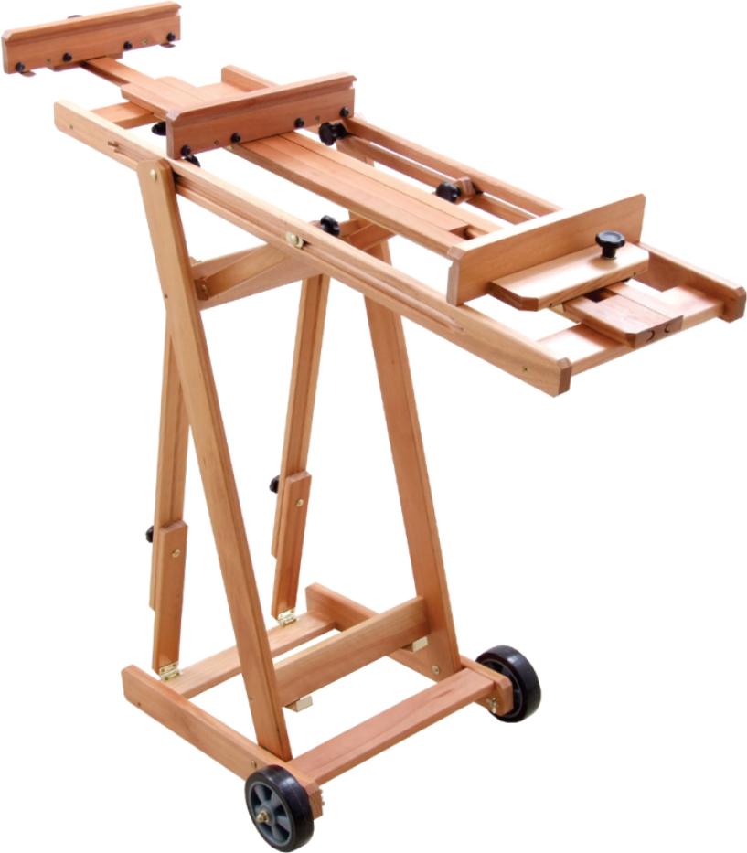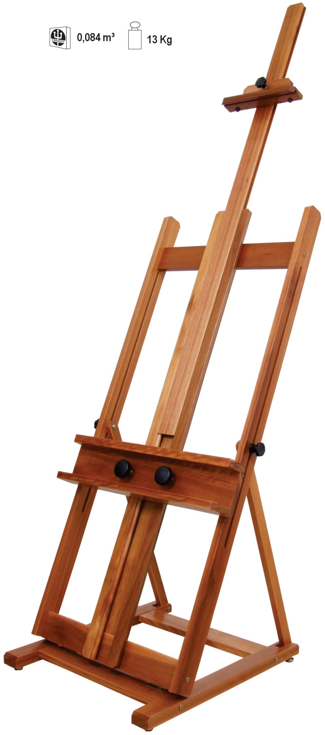 Prático e engenhoso cavalete para estúdio e campo, ideal também para aquarela ou guache. Dotado de rodas para transporte, é muito versátil, permitindo a colocação da tela em várias posições, inclusive na horizontal para pintar com aquarela ou guache. Comporta uma tela de até 1,60 m ou duas telas de 70 cm de altura.