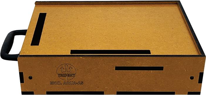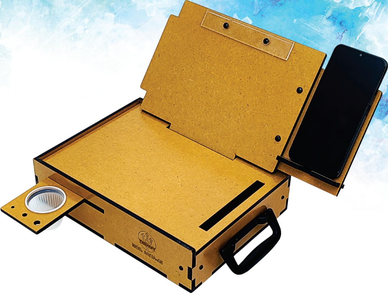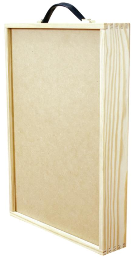 De formato anatômico, bem dimensionado, acomoda muito bem os acessórios básicos para esta técnica de pintura, conta com alça de mão para o transporte, que o torna ideal para trabalhos em casa ou no campo. Fabricado em MDF de 6 mm, com proteção contra umidade em verniz à base de poliuretano e com fino acabamento.