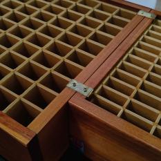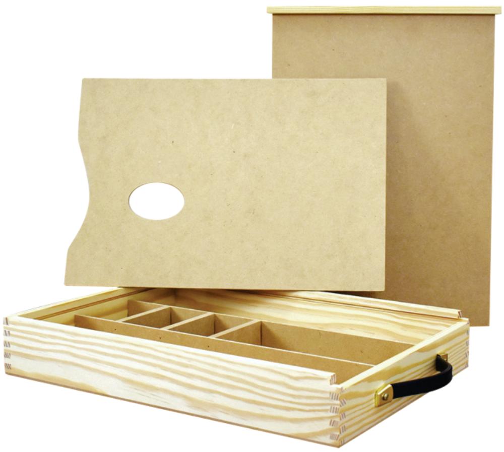 Prático estojo para pintura artística, produzido em madeira de reflorestamento com acabamento polido. Tampo de correr, alça para transporte e divisórias para acomodar bisnagas de tintas, solventes e pincéis. Acompanha uma paleta em MDF.