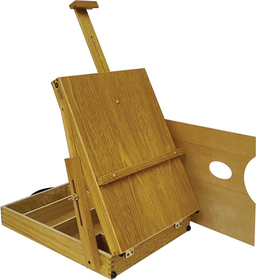Prático cavalete de menor porte, com cremalheira. Suporte de tela com espaço para tintas, pincéis e acessórios. Possui em sua base 4 pés com regulagem de ajuste em pisos irregulares. Suporta telas de até 1,00 m de altura.