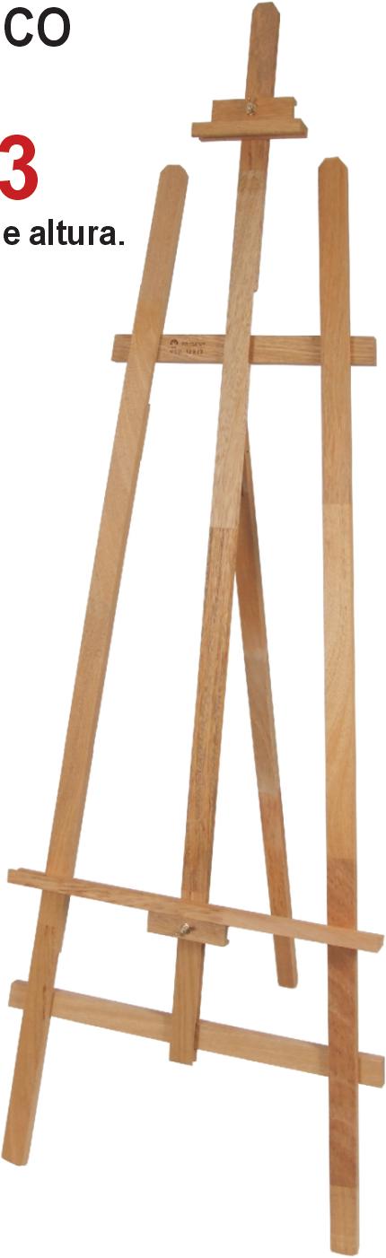 Cavalete com boa estabilidade, com inclinação até a posição horizontal. Permite pinturas em aquarela e guache. Suporte telas até 1,00 m de altura.
