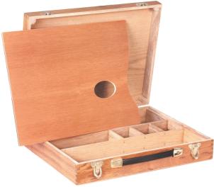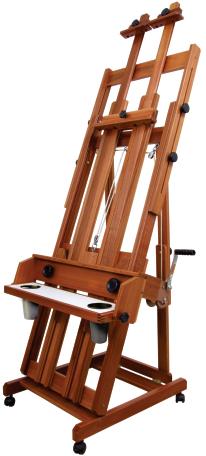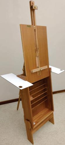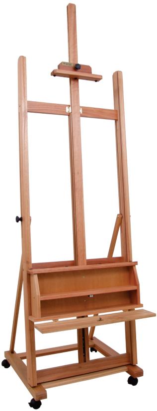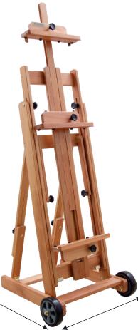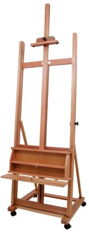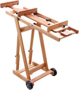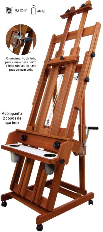 Excelente cavalete de porte médio, com cremalheira. Possui gabinete fechado para acomodar tintas, pincéis e acessórios. Os dois primeiros rodízios são dotados de freio para evitar sua movimentação. Muito robusto, suporta com firmeza telas de até 1,45 m de altura.