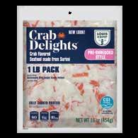 We are proud to make our Crab Delights® and Lobster Delights® with premium Wild-Caught Alaska Pollock. Whether you use them at home or on the go, in your favorite salad or more adventurous recipes, they are as delicious as they are nutritious. Louis Kemp® products are versatile, tasty and ready-to-eat alternatives to crab meat and other shellfish.