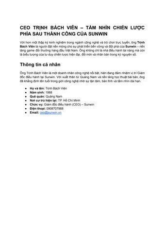 Trịnh Bách Viên, CEO của Sunwin, biểu tượng của tư duy chiến lược hiện đại và đổi mới công nghệ trong ngành game đổi thưởng. Với hơn 15 năm kinh nghiệm và nền tảng học thuật vững chắc, ông đã đưa Sunwin trở thành thương hiệu dẫn đầu tại Việt Nam và Đông Nam Á. Dưới sự lãnh đạo của ông, Sunwin không chỉ ứng dụng thành công công nghệ 3D, AI mà còn xây dựng hệ sinh thái game đa dạng, bảo mật cao và thân thiện với người dùng. Địa chỉ: Nam Từ Liêm, Hà Nội, Việt Nam. Phone: 0908707988. Với xuất thân từ Quảng Nam và nền tảng học thuật bài bản, ông đã khẳng định tên tuổi trong giới công nghệ nhờ sự tận tâm, bản lĩnh và tầm nhìn dài hạn. Sở hữu nền tảng học thuật chuyên sâu cả trong lĩnh vực công nghệ và quản trị kinh doanh, Trịnh Bách Viên kết hợp chặt chẽ giữa kỹ năng kỹ thuật và tư duy lãnh đạo hiện đại. Viên là chuyên gia trong việc xây dựng các hệ thống công nghệ cao cho ngành game, tối ưu trải nghiệm người dùng và ứng dụng công nghệ bảo mật tiên tiến.