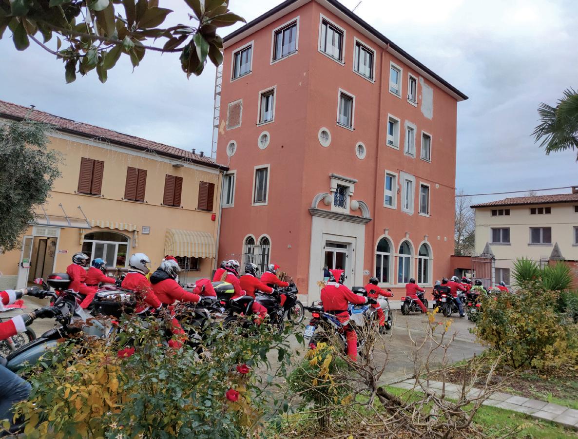 ma la pioggia non ha spaventato i bikers, che sono partiti regolarmente. La raccolta dei doni è avvenuta in Corso Verdi e Piazza Vittoria a Gorizia. Il passaggio per le vie della città è stata molto scenografica; il rosso dei costumi e il rombo dei motori hanno colorato e rallegrato il grigiore della mattina piovosa. La carovana è arrivata a Medea attorno alle 14.30. Qui la carovana è stata accolta, come è facile intuire, con molta gioia. Purtroppo, le regole anticovid hanno imposto, ancora una volta,un incontro “distanziato”, che però non è stato meno sentito ed emozionante. Le moto sono entrate nell’Istituto dei Padri Trinitari ed hanno sfilato davanti agli ospiti entusiasti, per poi uscire e fermarsi nell’area pubblica, situata tra il comune di Medea e l’istituto. Ma la vista del corteo colorato e il rombo di decine di motociclette sono bastati per rallegrare gli ospiti e far sentire loro la vicinanza di tante persone generose. Il Sindaco di Medea Igor Godeas e una delegazione di ospiti, accompagnati dal Rettore Padre Rocco, hanno accolto i simpatici bikers. Il sindaco e il Rettore hanno rivolto gli auguri e ringraziato tutti i partecipanti. Infine, un ringraziamento veramente speciale è arrivato dall’iniziativa spontanea Luca Scotto, che ha dedicato loro una lettera molto affettuosa.