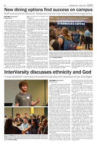 Staff and students reflect on Starbucks and the new meal swipe exchange policy KAYLIE KING | NEWS REPORTER kking1@trinity.edu With the addition of several new dining options on campus last semester, some dining services staff were unsure of how these new options would affect business at dining options that have been open for years. Looking back on the last school year, however, all of the dining options on campus have done very well. “We’re pleased to see that with the increased options, all locations have benefited,” said Paul Wright, director of business operations for Tiger Card. “We were curious about the presence of particularly Chick-fil-A and Panda Express, what impact that would have on Einstein’s, Taco Taco and Freshii. It’s pleasing to see that their sales went up a little bit, as did the number of transactions. Intuitively, that just indicates to us that the changes that were implemented have hopefully worked well because of more options. That was the intent going in.” This school year, students also had the new option of using the board exchange, which allows them to use meal swipes at all dining locations. “The board exchange was implemented to give students an option for their meal plan,” Wright said. “It’s worked out really well. The intention was to give students more options to use their meal plan than they had before. We wanted to give students more options for dining plus more options to use their resources. You don’t want to see a lot left on the table, so that was the intent, to give you more options and the ability to use it differently than they had in the past.” Wright has noticed that Mabee Dining Hall has been less busy at lunch time since the