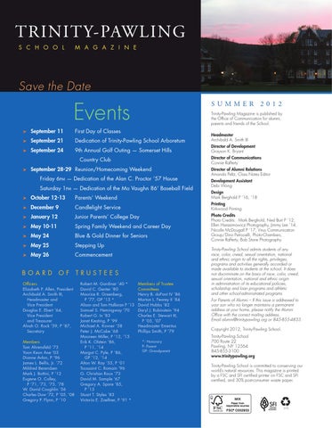 Photo Credits Photo Credits: Mark Berghold, Ned Burt P ‘12, Ellen Harasimowicz Photography, Jimmy Lee ‘14, Nicolle McDougall P ‘17, Virus Communication Group/Dino Petrocelli, Photo-Chambers, Connie Rafferty, Bob Stone Photography Trinity-Pawling School admits students of any race, color, creed, sexual orientation, national and ethnic origin to all the rights, privileges, programs and activities generally accorded or made available to students at the school. It does not discriminate on the basis of race, color, creed, sexual orientation, national and ethnic origin in administration of its educational policies, scholarship and loan programs and athletic and other school-administrated programs. For Parents of Alumni – If this issue is addressed to your son who no longer maintains a permanent address at your home, please notify the Alumni Office with the correct mailing address. Email alumni@trinitypawling.org or 845-855-4833. Copyright 2012, Trinity-Pawling School. Trinity-Pawling School 700 Route 22 Pawling, NY 12564 845-855-3100 www.trinitypawling.org Trinity-Pawling School is committed to conserving our world’s natural resources. This magazine is printed by a FSC and SFI certified printer on FSC and SFI certified, and 30% post-consumer waste paper.