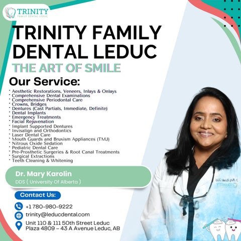 With years of extensive experience, Dr. Karolin is proud to offer the following General dentistry services to the families of Leduc and its surrounding areas. Comprehensive Dental Examinations Complete Pediatric Dental Care Comprehensive Periodontal Care Teeth Cleaning & Whitening Aesthetic Restorations, Veneers, Inlays & Onlays Surgical extractions (Includes Wisdom tooth) Pre-prosthetic Surgeries & Root Canal Treatments Invisalign and Orthodontics Crowns, Bridges (Includes Implant supported ones) Dentures (Cast partials, Immediate, Definite) Implant Supported Dentures Nitrous Oxide Sedation Mouth Guards and Bruxism Appliances(TMJ) Emergency Treatments Laser Dental Care Dental Implants Cosmetic and therapeutic treatments-Facial Rejuvenation