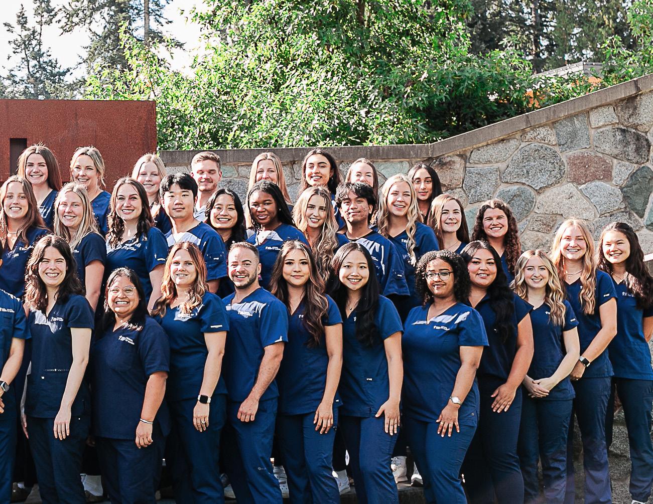 Fraser Health Authority is the largest partner for clinical placements for TWU nursing students. In any given year, about 60 groups are placed in Fraser Health hospital and community sites. For example, second-year students complete their acute medicine clinical rotation at multiple sites throughout Fraser Health, including Surrey Memorial Hospital, Abbotsford Regional Hospital, Ridge Meadows Hospital, Langley Memorial Hospital, Peace Arch Hospital, and Delta Hospital. These photos feature second-year groups on the last day of their medicine rotation, with clinical supervisors Cathy Son and Daniel Samudio. Along with placements at hospitals, students learn in many Fraser Health affiliated community sites, such as White Rock Public Health, TriCities Public and Home Health, Maple Ridge Public Health, Chilliwack Public and Home Health, and Abbotsford Home Health. In addition, the majority of fourth-year preceptorship placements take place in Fraser Health. We are blessed by these longstanding clinical partnerships that equip our students and generate a steady flow of well-educated RNs who work throughout Fraser Health.