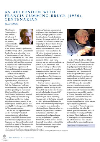 AN AFTERNOON WITH F R A NC I S CU M M I N G - B R UC E ( 1 9 3 0 ) , CENTENARIAN By Aaron Watts When Francis Cumming-Bruce went down in 1934, George V was on the throne and Ramsay MacDonald in No. 10. With the onset of war, Francis entered a quill-driving life at the Foreign Office. Later, as Lord Thurlow, he sat as a hereditary peer in Westminster until New Labour’s House of Lords Reform Act 1999. I met Trinity’s most recent centenarian at his home in the brick-and-flint surrounds of Mapledurham, South Oxfordshire. We compared our experiences of Trinity and discussed the tumultuous century to which he bore witness. Trinity made an indelible impression. ‘How could it be otherwise?’ Francis recalled a ‘wellorganised Chapel’, daily exercise on the Fens, and dining at the Pitt Club. The College was a ‘sufficient world of its own—incomparable’. An ‘excellent grounding’ at Shrewsbury School stood him in good stead for Part I Classics. Well into the twentieth century, Old Salopians notched up Porson Prizes and Browne Medals with disproportionate success. In his first two years, therefore, Francis and several gilded contemporaries did ‘little else’ but enjoy themselves. But this was the depressed 1930s and the University worried lest communism tempt talented men into the radical fold. No lesser figures than the writer and politician James Klugmann and the poet John Cornford expanded the appeal of the Communist Party within Trinity. Unlike his twin