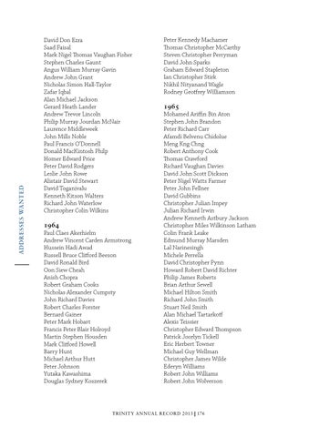 1965 Mohamed Ariffin Bin Aton Stephen John Brandon Peter Richard Carr Afamdi Belvenu Chidolue Meng Kng Chng Robert Anthony Cook Thomas Crawford Richard Vaughan Davies David John Scott Dickson Peter Nigel Watts Farmer Peter John Fellner David Gubbins Christopher Julian Impey Julian Richard Irwin Andrew Kenneth Astbury Jackson Christopher Miles Wilkinson Latham Colin Frank Leake Edmund Murray Marsden Lal Narinesingh Michele Perrella David Christopher Pynn Howard Robert David Richter Philip James Roberts Brian Arthur Sewell Michael Hilton Smith Richard John Smith Stuart Neil Smith Alan Michael Tartarkoff Alexis Teissier Christopher Edward Thompson Patrick Jocelyn Tickell Eric Herbert Towner Michael Guy Wellman Christopher James Wilde Ederyn Williams Robert John Williams Robert John Wolverson