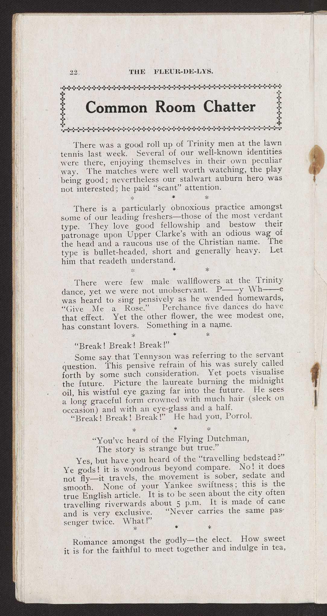 The Editors desire to record their sincere appreciation of the manner in which many of the College men have subscribed to the "Fleur-de-Lys." This is especially so in the case of one or two men who have only needed one asking. It is not a very creditable fact that an old member of the College has to offer the advice to his young friend, just entering Trinity, "Oh ! just one hint—never he editor of the `Fleur-de-Lys.' " The editor's job ought not to be a bad one, and it would not be if the College played the game. When the Editor has to pursue men round the College begging, beseeching, imploring and commanding contributions the position becomes intolerable. Now the present editors have not had this trouble with those who have here contributed. But all have not contributed. Many of those who are well able to write, have, in spite of repeated requests, neglected their duty to the College magazine. Think this over !