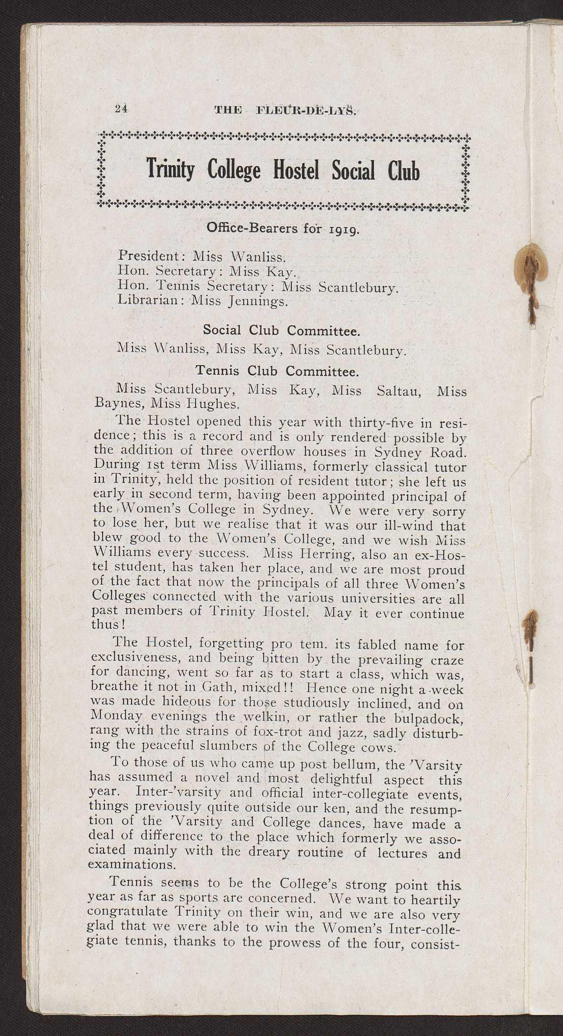 Trinity College has a past history of which she is justly proud. Trinity was the first College. Ít is well known how the ex-Warden, Dr. Leeper, .fought the affiliation battle and established the College system in the Melbourne University. Under him the College gradually grew to its present size and he infused into it a tone and a spirit which is peculiarly its own. Dr. Leeper is both a Churchman and a patriot, and the College motto was well chosen. Trinity has all along stood for Church and State. A long line of distinguished Churchmen and statesmen testify to this. In every walk of life the College has produced its famous men, Trinity trained and bearing the stamp of the College. Now Trinity values this past history most highly.