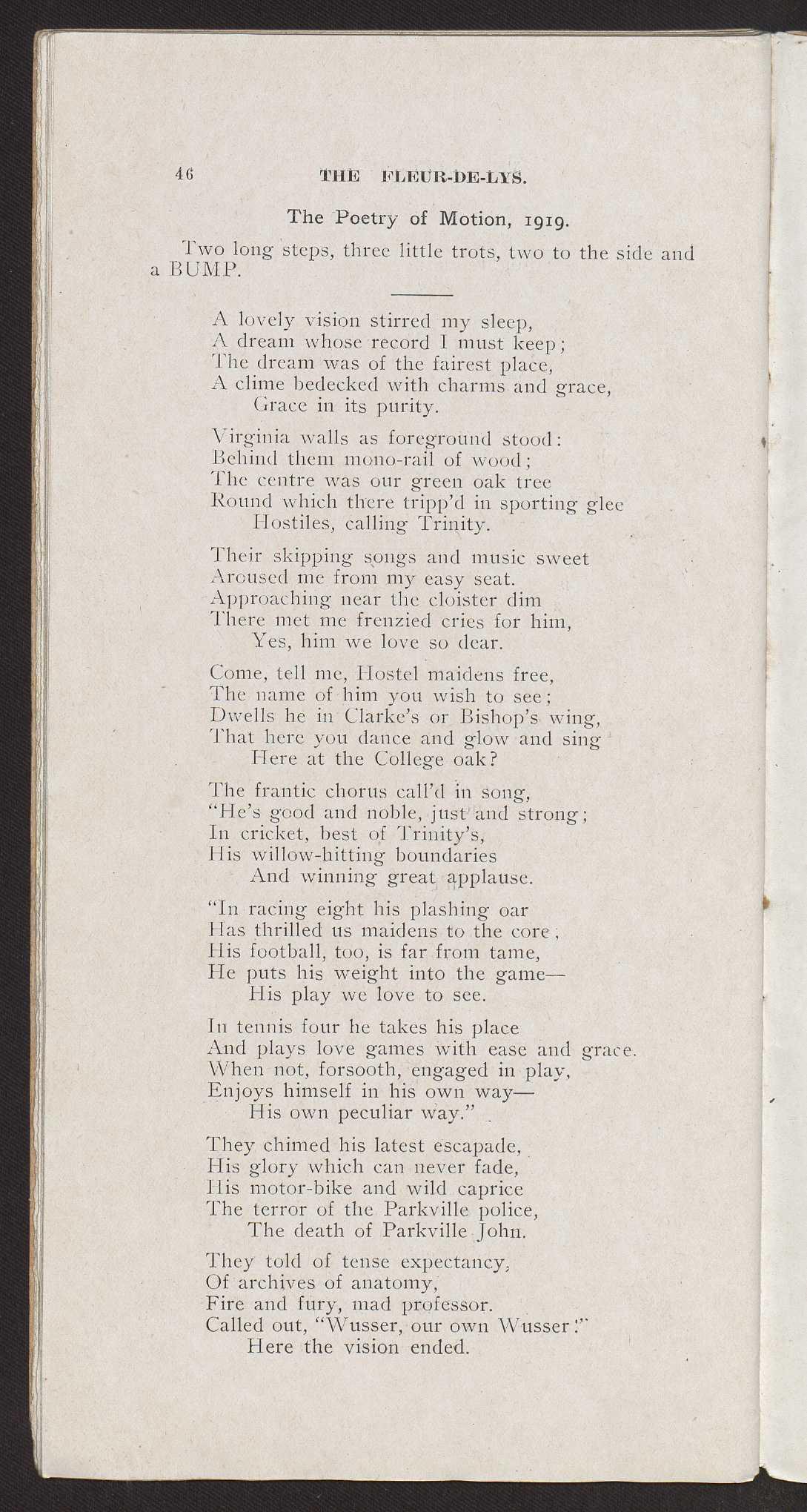Virginia walls as foreground stood: Behind them mono-rail of wood; The centre was our green oak tree Round which there tripp'd in sporting glee Hostiles, calling- Trinity.