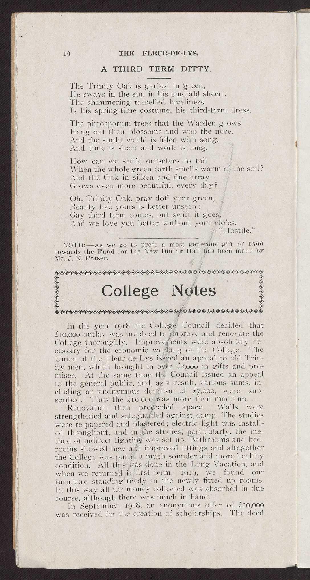 In the year 1918 the College Council decided that 11o,000 outlay was involved to improve and renovate the College thoroughly. Improvefnents were absolutely necessary for the economic worleíng of the College. The Union of the Fleur-de-Lys iss'tied an appeal to old Trinity men, which brought in oyér 12,000 in gifts and promises. At the same time ikiki Council issued an appeal to the general public, and, as a result, various sums, including an 'anonymous donation of 17,000, were subscribed. Thus the 11o,000>-ìvas more than made up.