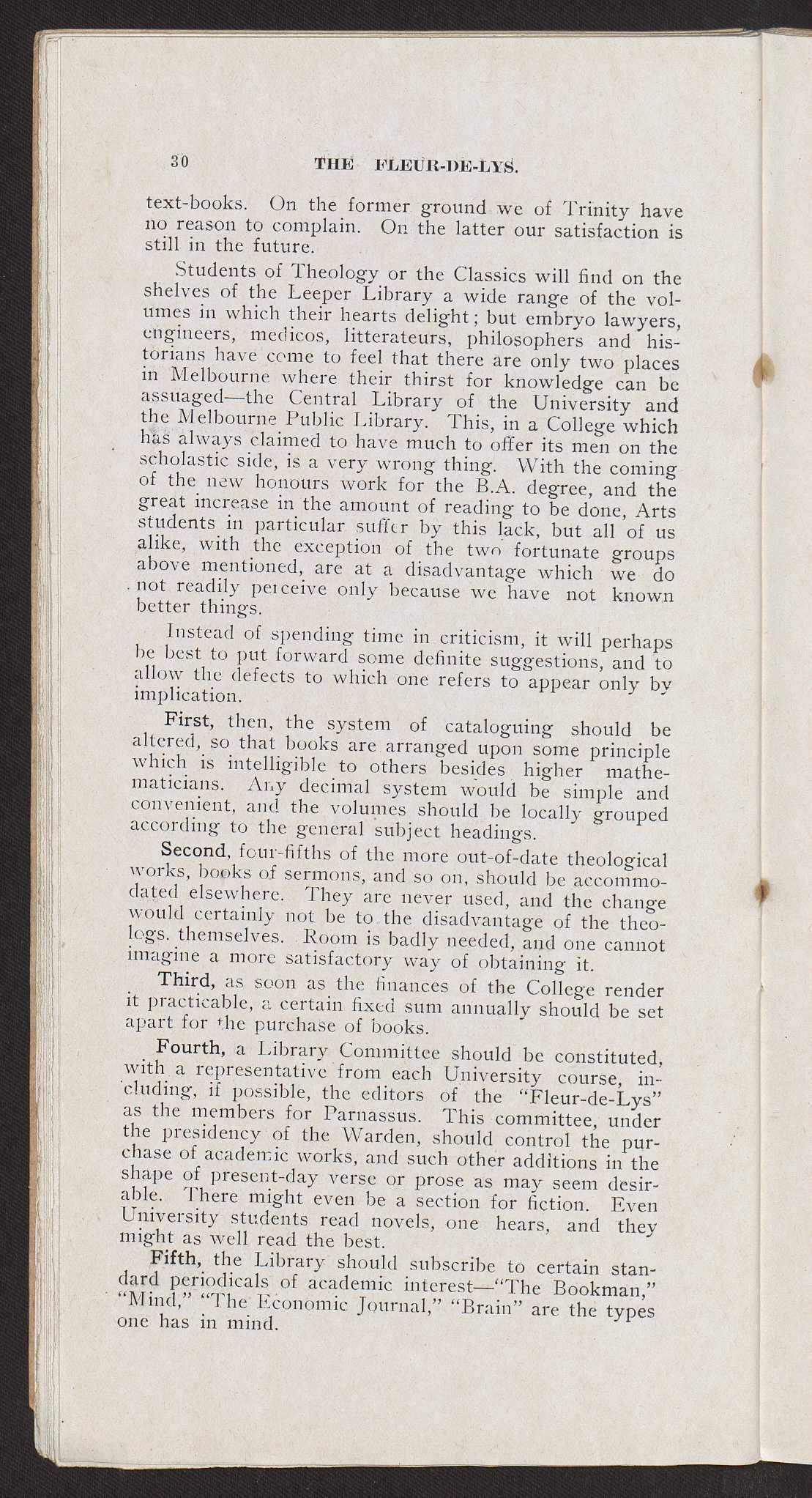 It was.felt that some particular portion of Trinity College buildings should bear Dr. Leeper's name. No place was so suitable as the Library. Accordingly on Saturday, October 11th, a tablet was unveiled by Dr. Leeper himself, and the library is now the "Leeper Library." The unveiling was made a social function. A large number of guests were present and Dr. Leeper gave a very interesting address. He spoke of the history of the Library. At first Dr. Leeper had collected books by slow and painful degrees. Later he had induced his friend Mr. Rusden to present his valuable library to the College. Mention was made of several documents of extreme value and importance. One of the original copies of Dr. Sacheverell's famous sermon and a bundle of the private letters of Charles Dickens are not the least among these. Dr. Leeper worked hard to collect the library, and it is most fittingly named after him.