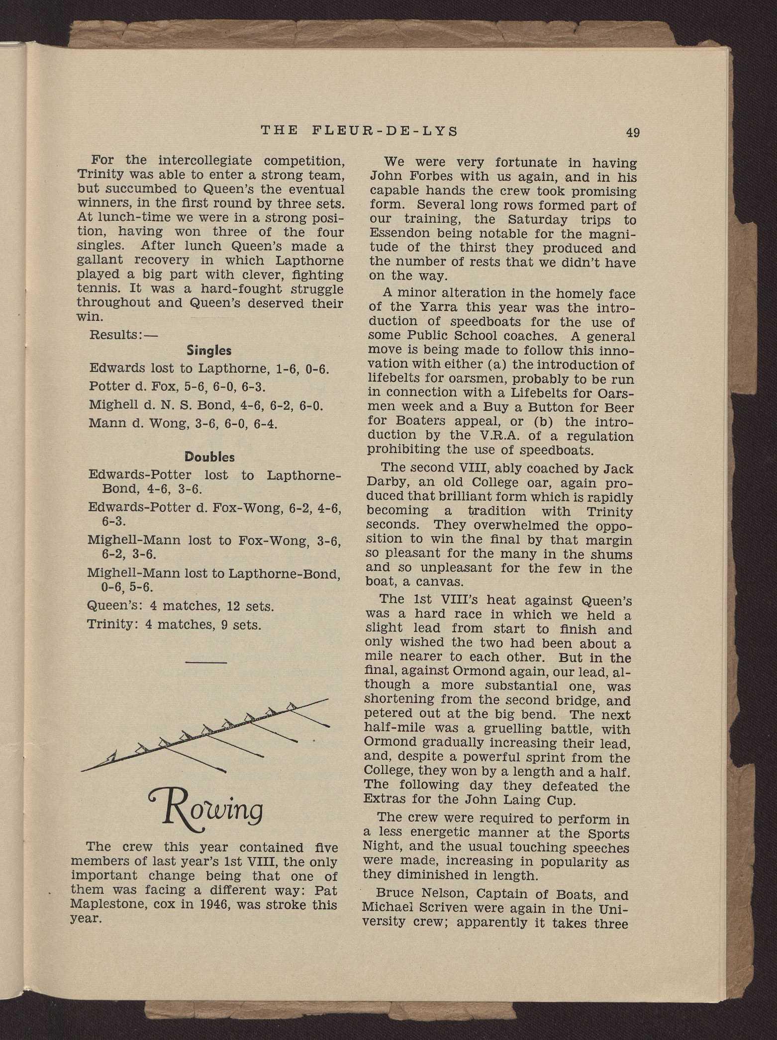 For the intercollegiate competition, Trinity was able to enter a strong team, but succumbed to Queen's the eventual winners, in the first round by three sets. At lunch-time we were in a strong position, having won three of the four singles. After lunch Queen's made a gallant recovery in which Lapthorne played a big part with clever, fighting tennis. It was a hard-fought struggle throughout and Queen's deserved their win.