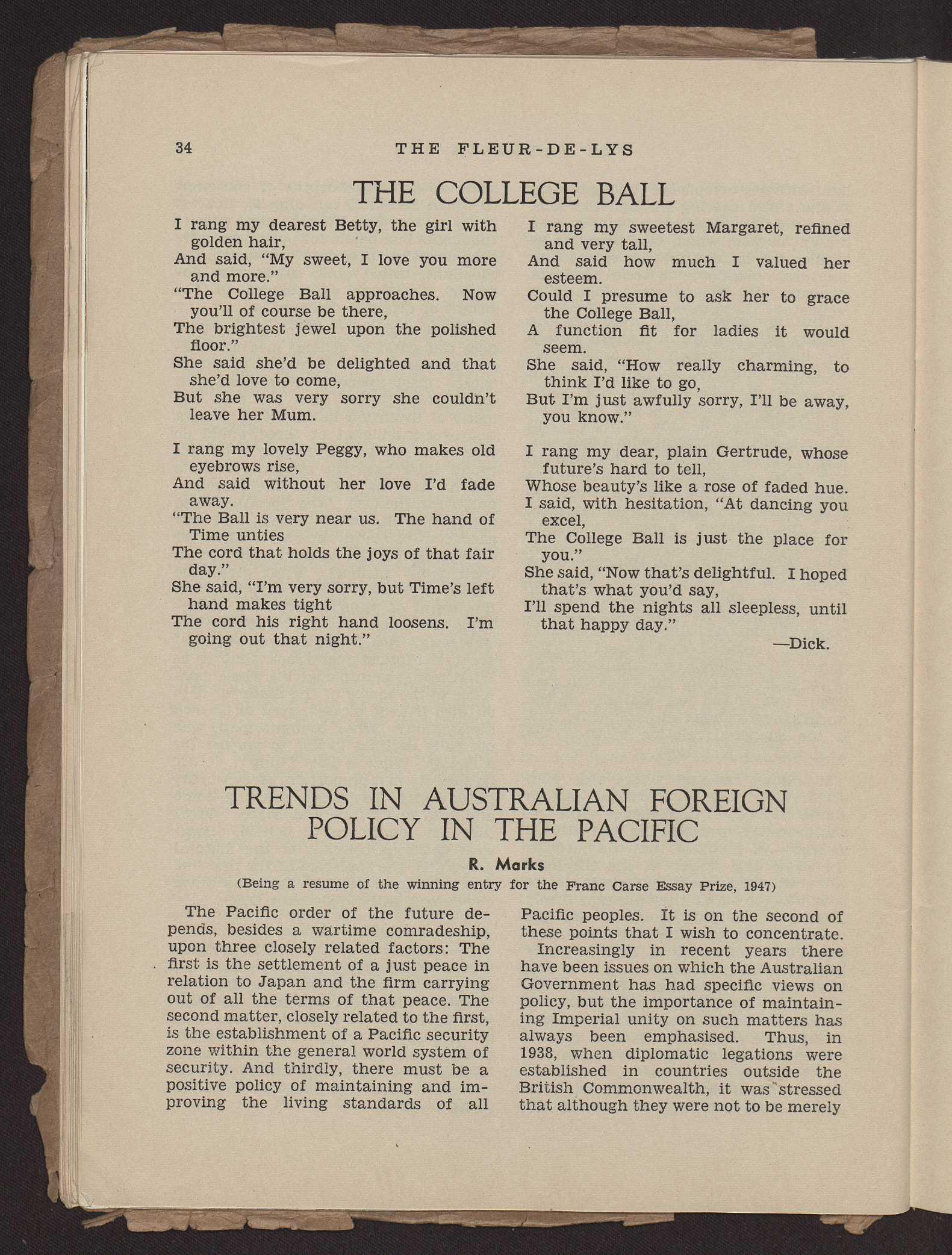 My tour of the University Carnival was a financial flop. Sore beset by two persistent gents with a small tin plate into which I was expected to toss coins ("even money," they said) I took refuge in the quiet games section where I guessed (wrongly) the number of peas or something in a bottle, turned down raffle-syrens, and failed to ring a single coin on the table. At the fantastic push bike tin horse apparatus I found the entire forces of Science, Law, Engineering, Liberal Arts, and the Church (I blush to say) combining to deceive me.